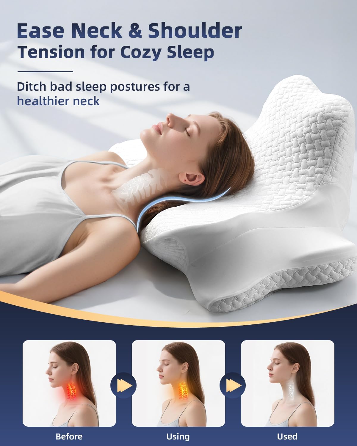 【Ergonomic Contoured Support – A Scientific Solution To Sleep Discomfort】 This memory foam pillow features a precisely engineered contour that naturally fits the curvature of the head, neck, and shoulders. Whether you sleep supine, prone, or on your side, it adapts to your posture and maintains proper spinal alignment. The slow-rebound memory foam distributes pressure evenly, significantly reducing tension around the cervical spine and shoulders. Wake up refreshed and free of stiffness, finally saying goodbye to restless nights and poor sleep posture.