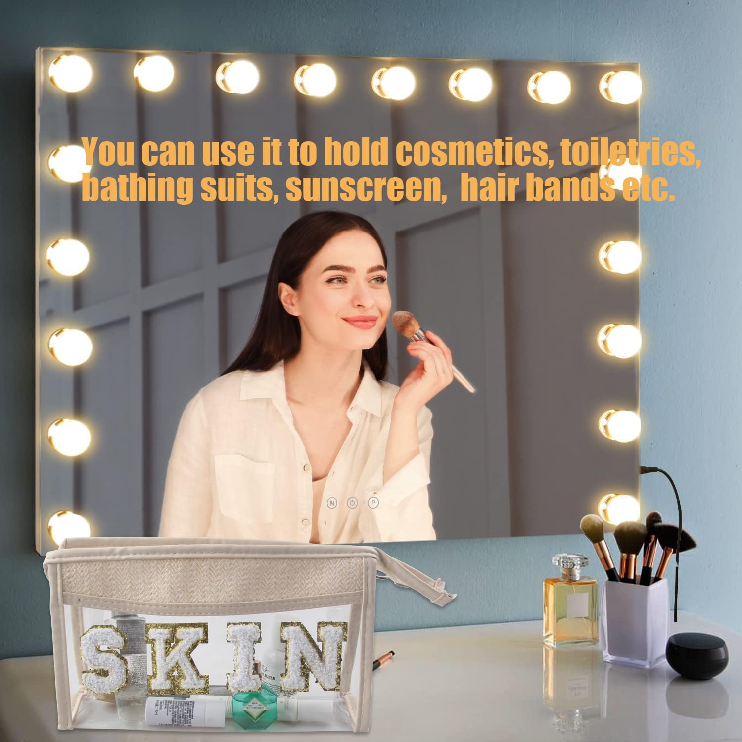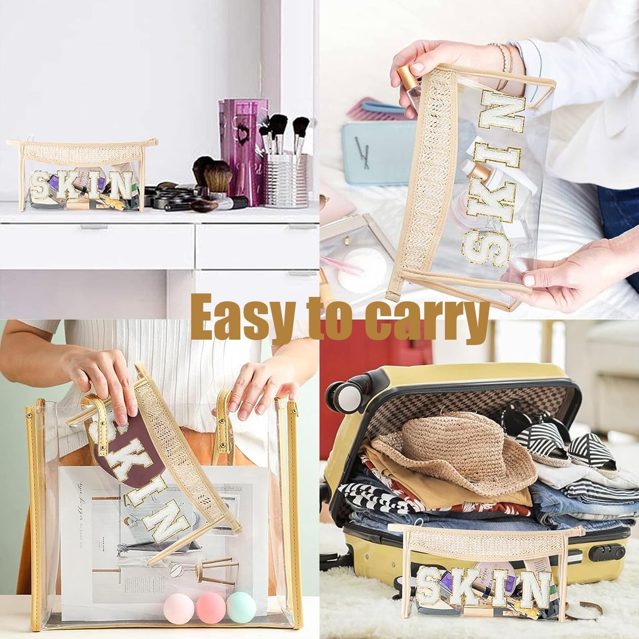 【Glitter Chenille Letter Clear Bag】Clear Boho Patch Makeup Bag has gold glitter letter patches and the letters are made of delicate towel embroidery and non-woven fabric. Firmly sewn on the bag, you don’t have to worry about them falling off. These colorful letters have a gold glitter border to make your clear cosmetic beach bag look very bright and vivid!