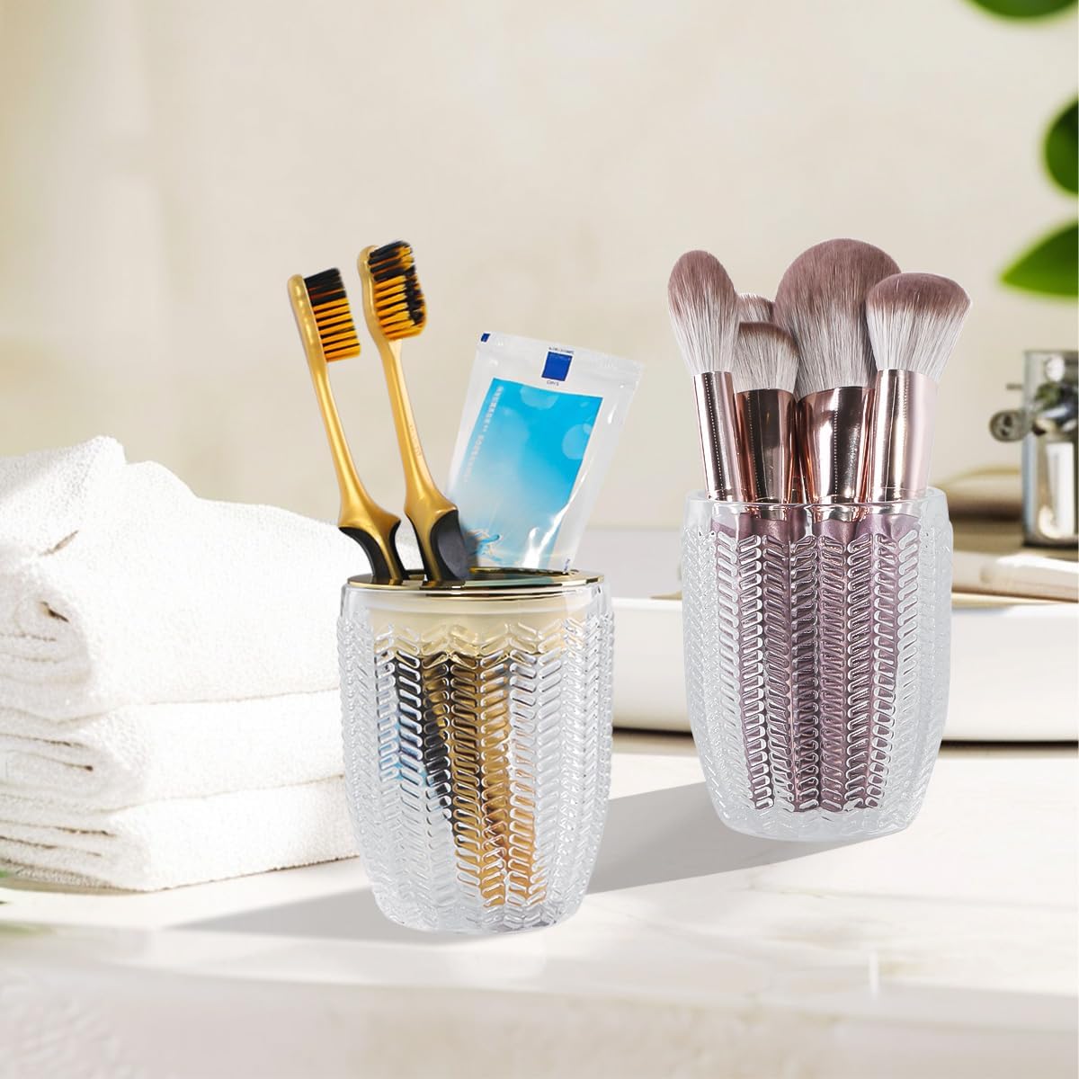 Clear Toothbrush Holders for Bathrooms, Glass Toothbrush Holder and Bathroom Tumbler Cup, 10oz Bathroom Storage Cups, Gold Tooth Brush Cup Holder Organizer for Brushes, Toothpaste, Razor