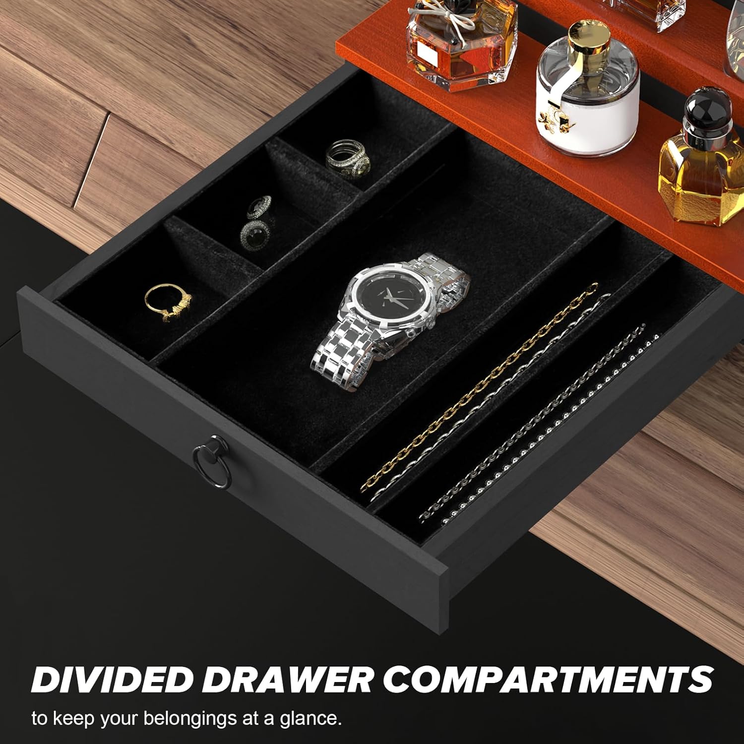 DIVIDED DRAWER COMPARTMENTS FOR MEN’S STYLE: The cologne organizer is compactly designed to enhance the aesthetics of your space.The bottom divider drawer keeps your belongings at a glance and allows you to store watches, rings, bracelets and necklaces. Each level holds multiple bottles of perfume to showcase your unique fragrance tastes, allowing you to easily access and choose your favourite scent.