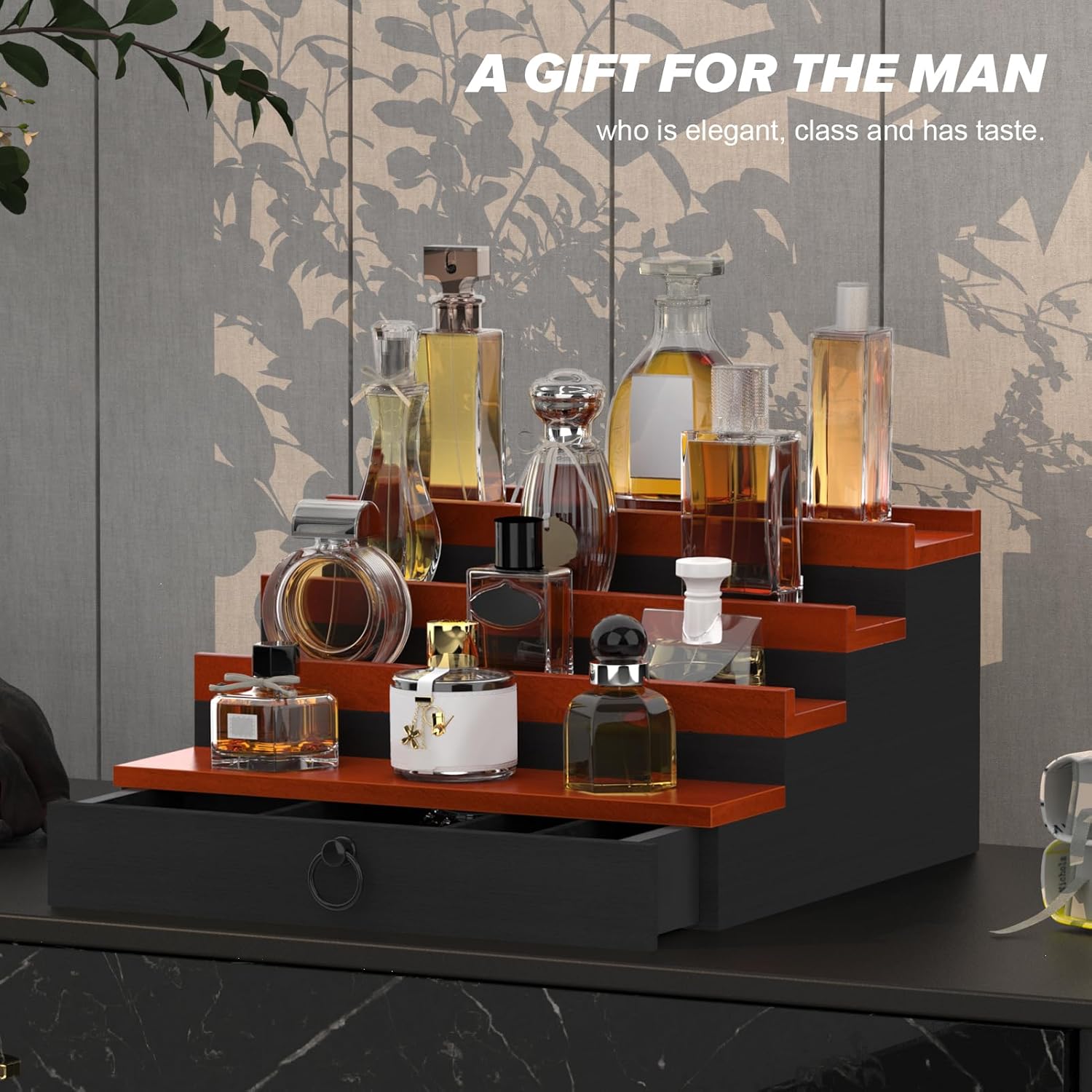 Cologne Organizer for Men, 4 Tier Perfume Stand, Cologne Shelf with Drawer and Hidden Compartment Perfume Display Holder, A Gift for Men