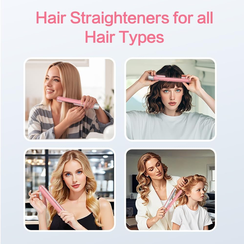 Cordless Hair Straightener, Portable Mini Flat Iron Hair Straightener for Travel, 20s Fast Heating, USB-C Rechargeable, Hair Straightening and Curler 2 in 1 for Women (Pink)