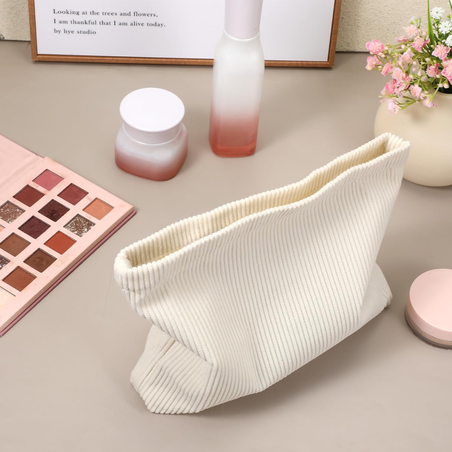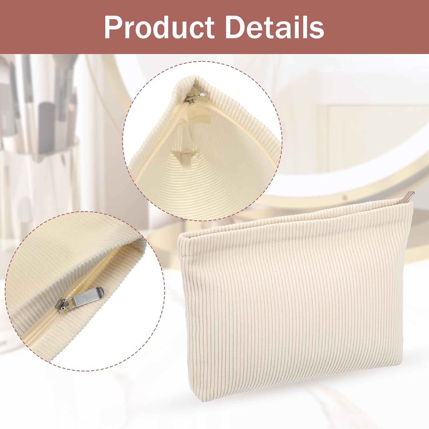 Portable Size: This large beige corduroy cosmetic bag measures 9.65 x 8.66 x 7.09 inches and can be placed in a suitcase or backpack for easy carrying. The cosmetic bag has sufficient capacity to hold cosmetics, skin care products, perfume, and other necessary items, which is very practical.