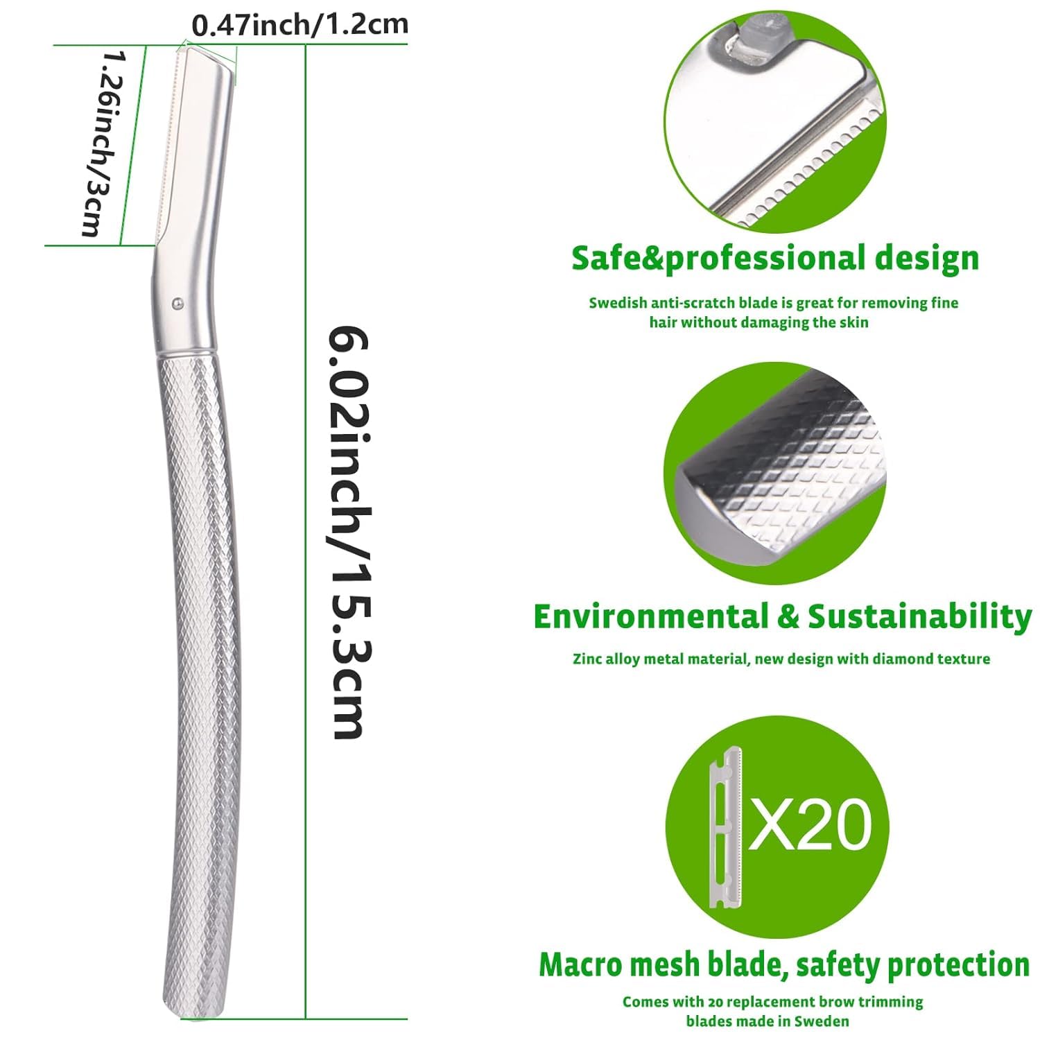 Dermaplaning Tool with 20 Replaceable Blades, Face Exfoliation Razor, Peach Fuzz Removal, Eyebrow Shaper (Silver)