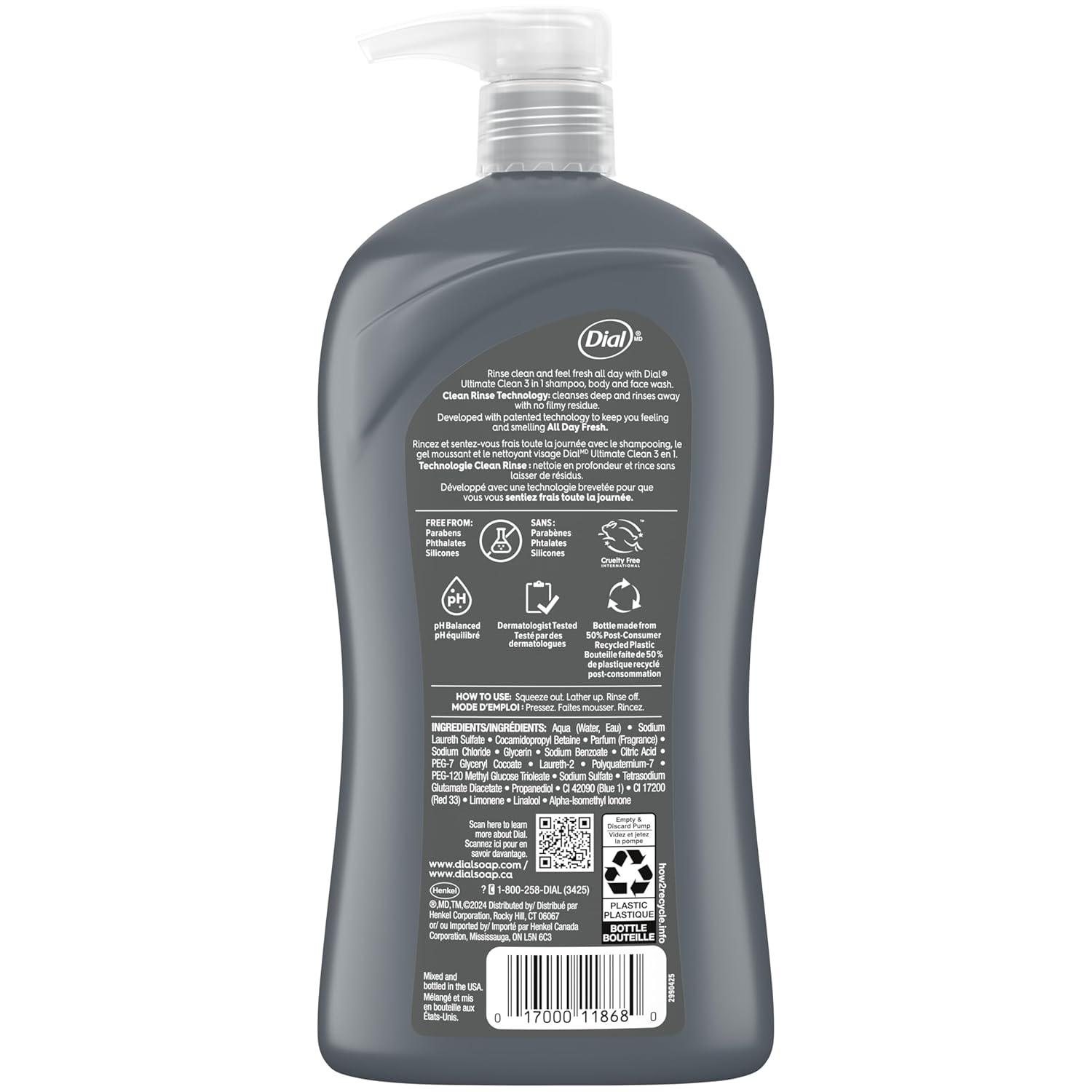 Dial Mens Body Wash 3 in 1 Ultimate Clean Formula for Hair, Body & Face Start your day with the no-nonsense clean of Dial Men 3 in 1 Body, Hair and Face wash. The convenience of shampoo, body and face wash in one handy bottle, engineered for an all-in-one solution. Developed with Clean Rinse Complex and Deep Clean Technology to dial up your clean, this formula removes dirt and impurities, rinses clean without residue, and leaves your skin and hair feeling clean. Crafted with moisturizing ingredients and a rich creamy lather, it’s pH balanced, non-drying, and designed to clean deeply without drying—a simple solution that’s tough on dirt and gentle on skin. Dial Men Skin Smart formulas are made without parabens, phthalates and silicones, leaving skin looking and feeling hydrated and healthy. Bottle is recyclable, and made from 50% Post-Consumer Recycled Plastic* you can feel good about, and an aloe scent that will leave you feeling all day fresh. *Excluding pumps Delivering clean confidence for over 70 years, Dial is committed to providing formulas that care for skin without compromise—thoughtfully crafted and approved as cruelty free under the Leaping Bunny program. Gentle, reliable cleansing for everyone in your home.