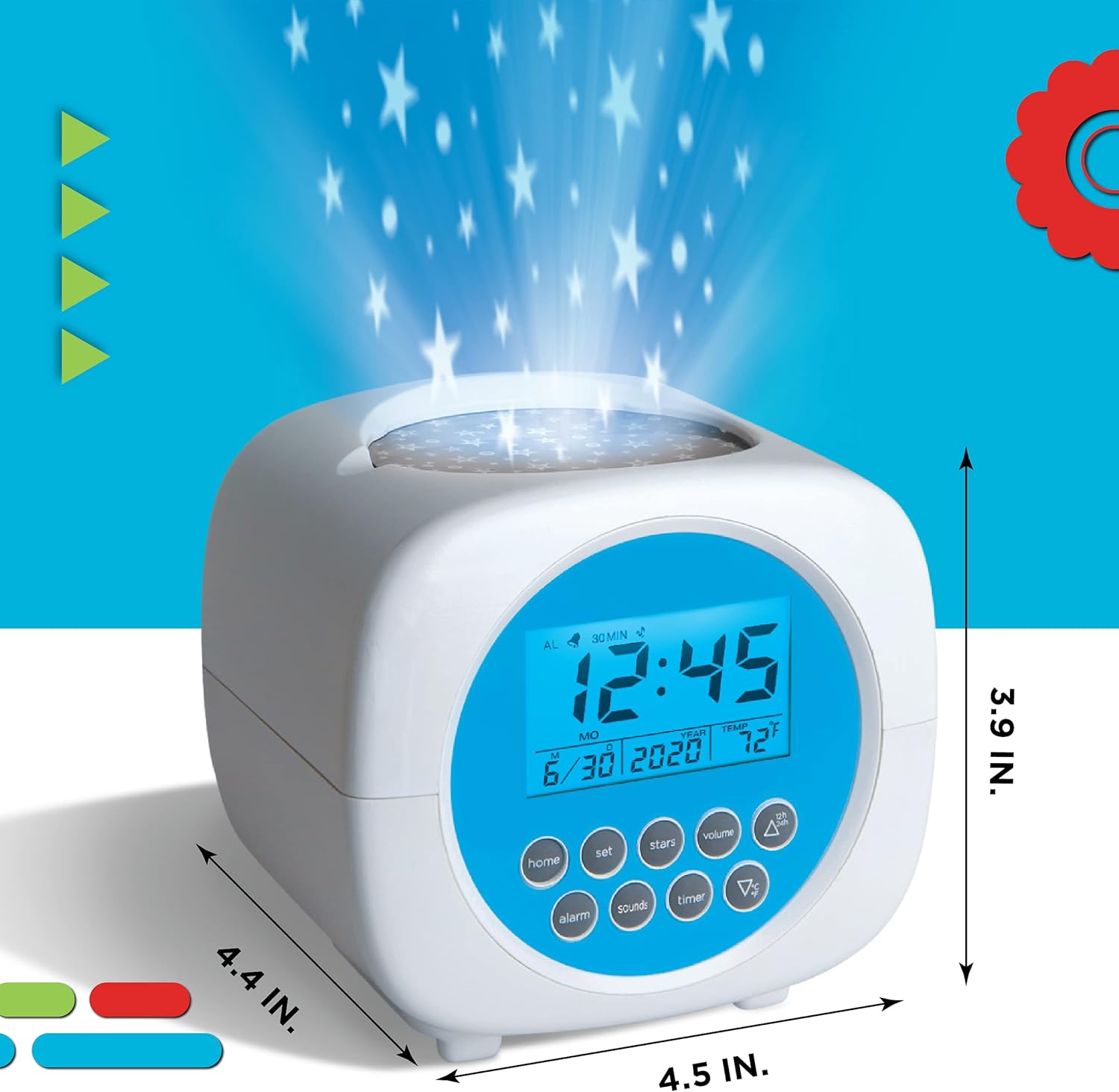 Star mode turns on the projector on the top of the clock, projecting a fun, rotating pattern of green, red, and blue stars! This also backlights the LED screen for nighttime use.