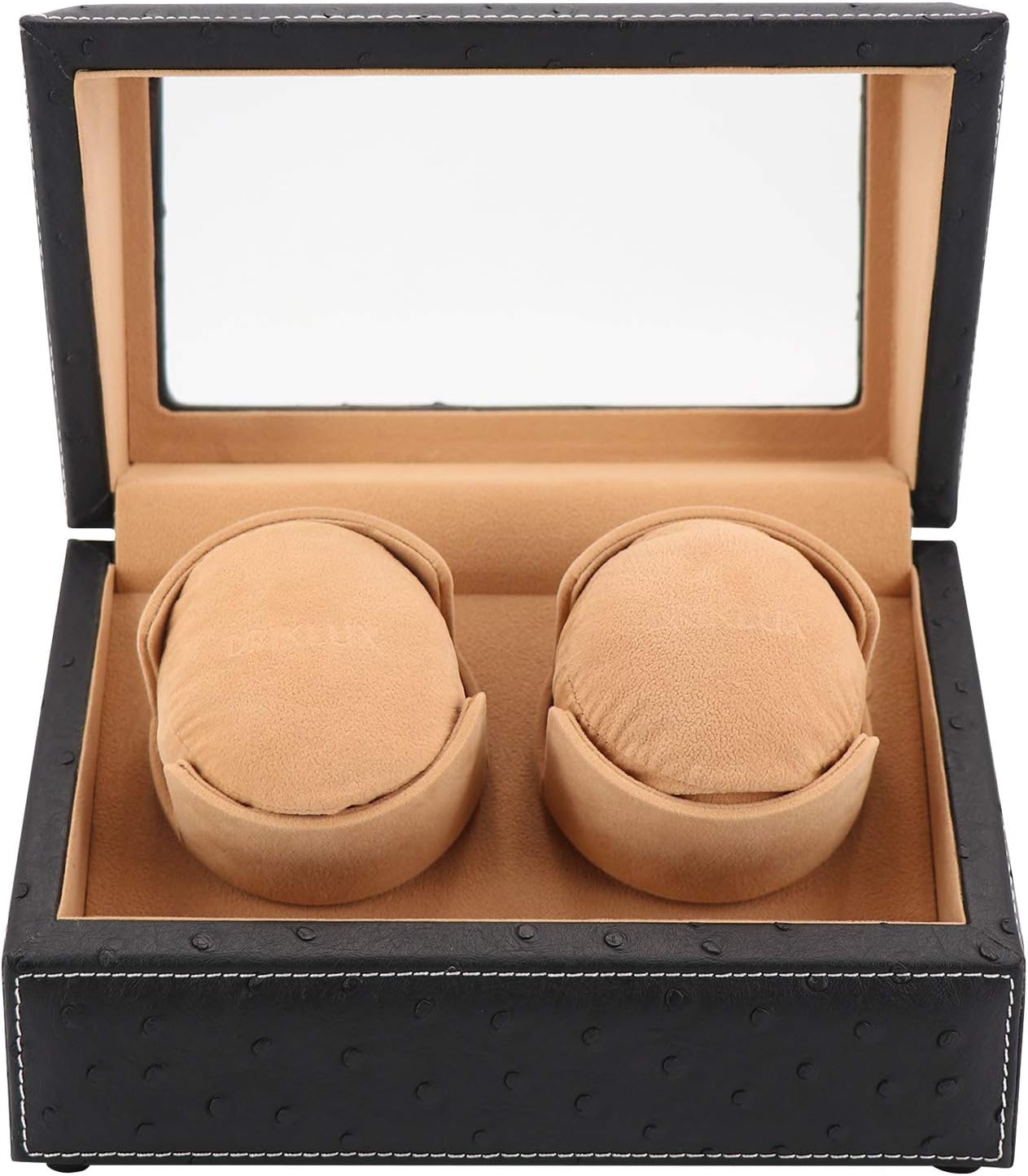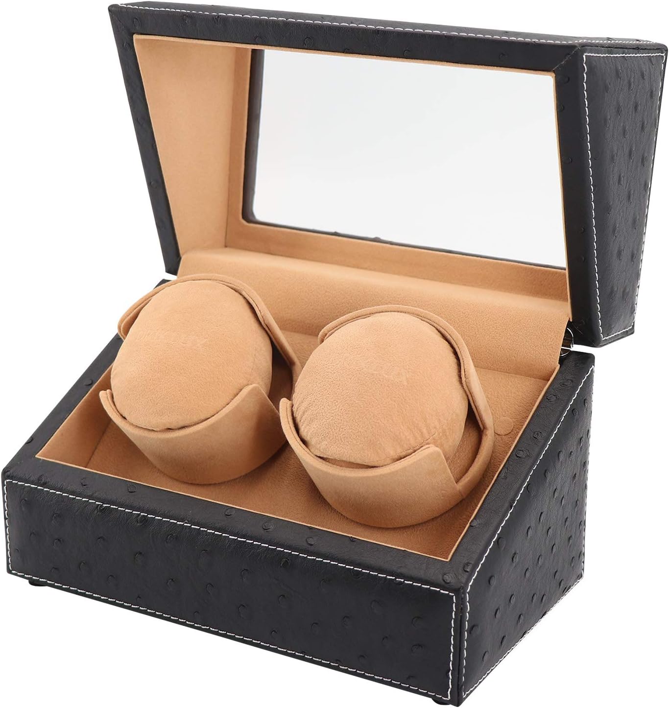 Double Watch Winder for Rolex and Other Luxury Watches – Automatic Winder with Quiet Motor, Premium Black Ostrich Leather Exterior and Soft Flexible Watch Pillows of Camel Velvet