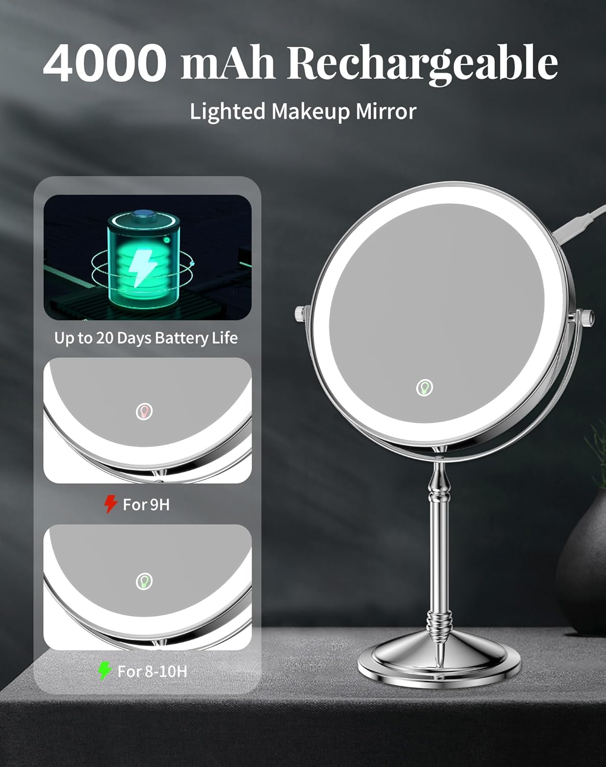 DOWRY 4000 mAh Rechargeable Lighted Makeup Mirror 20x Magnification Vanity Mirror Tabletop Two-Sided Swivel Gifts Women Chrome