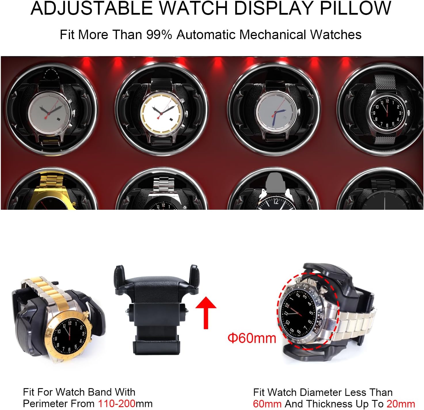 The watch winders use a retractable spring watch pillow. Fit Watch Dia. Less Than 60mm. IT CAN HOLD A 110-200MM WATCH BAND.