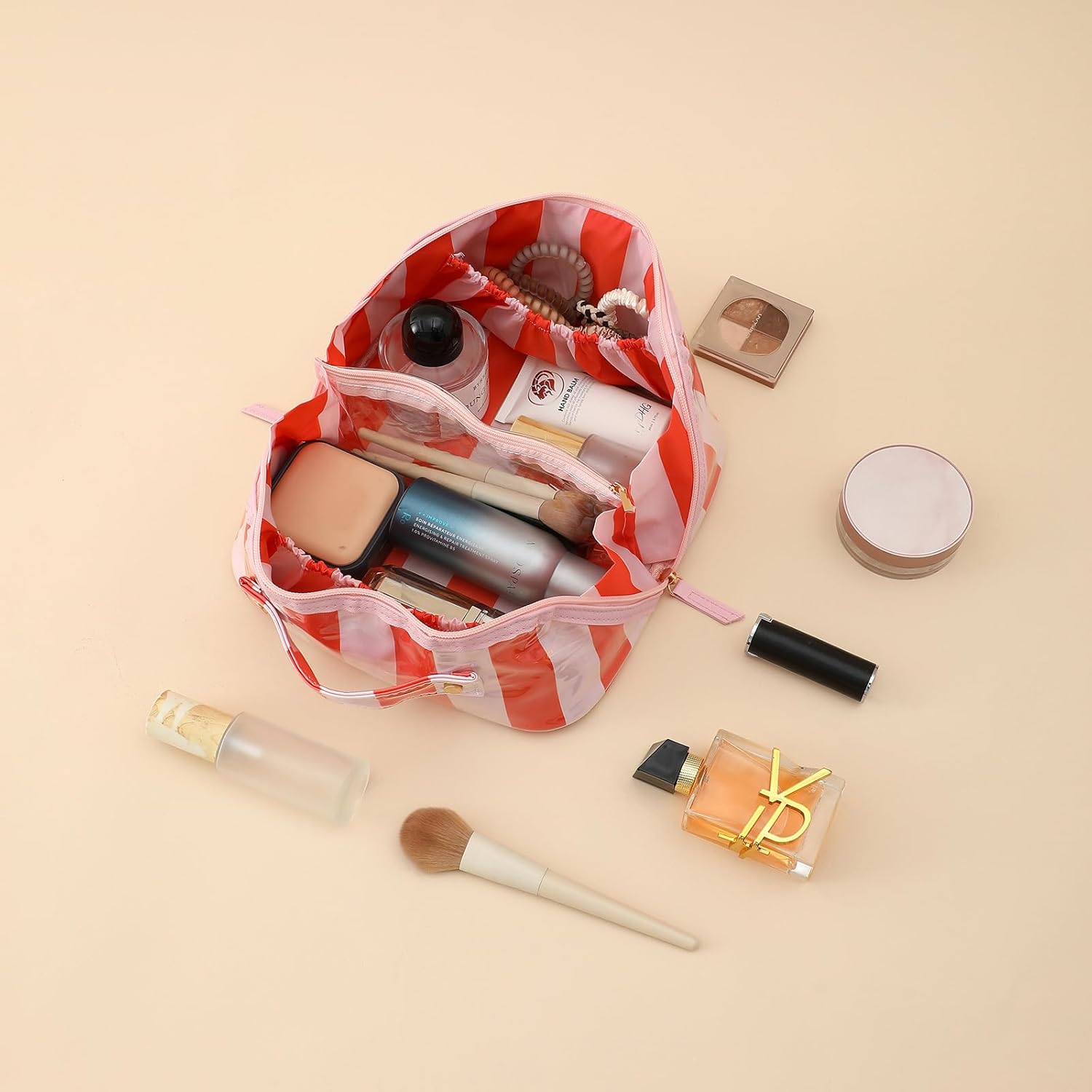 Large Capacity:Measuring 9.25*5.25*6.5 inches.This cosmetic pouch features 3 compartments and 3 separate pockets to neatly store cosmetics, brushes, and skincare, making it perfect as a big makeup bag for long trips