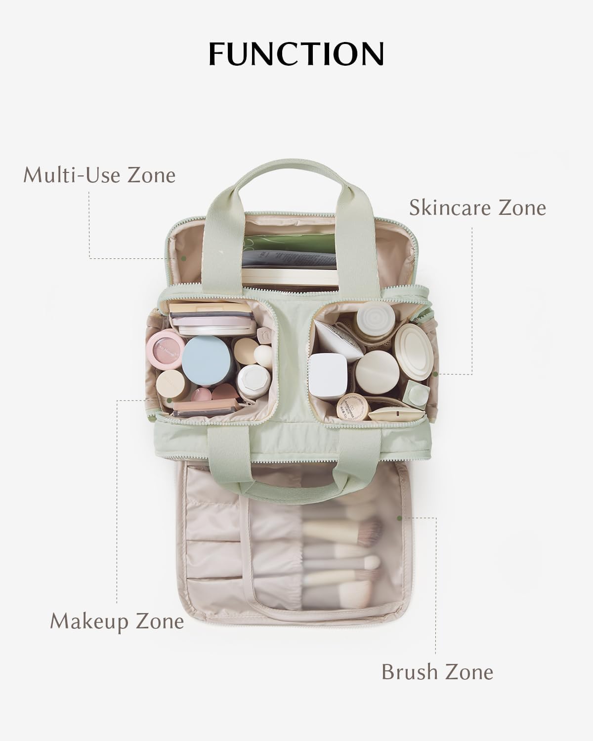Wide-Open & Upright Shape – The wide-opening design ensures quick access to your cosmetics, while the middle compartment keeps bottles standing upright to prevent leaks. Perfect as a standing makeup bag for vanity use or as a travel makeup organizer for your suitcase.