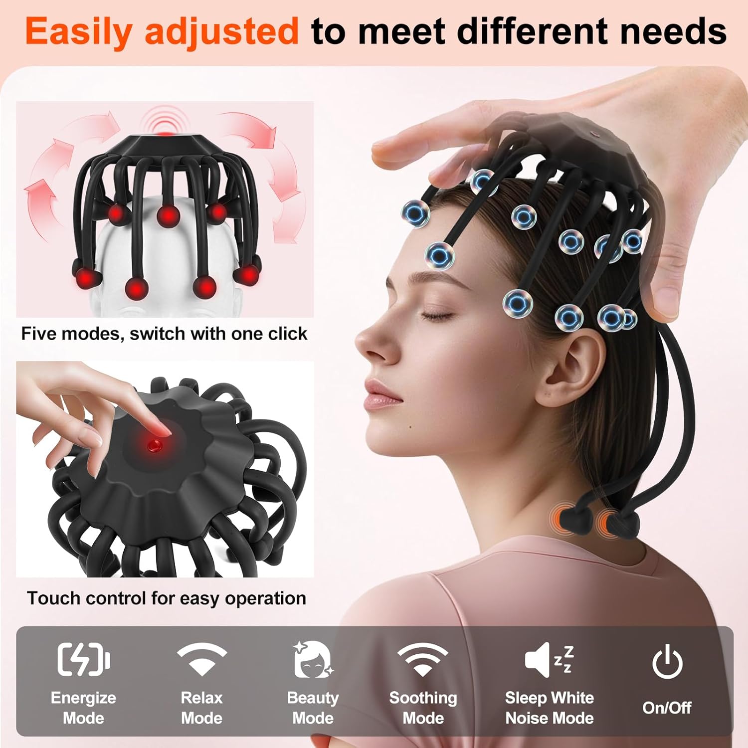 【Customizable Modes for Scalp Massage Tool】Personalize your relaxation with this electric scalp massager, offering five versatile massage modes (Energize, Relax, Soothing) to match your mood. As a premium scalp massage tool, it provides a tailored head massager experience, perfect for unwinding. This portable scalp massager ensures a soothing massage, making it a go-to device for a calming scalp massage session anytime.