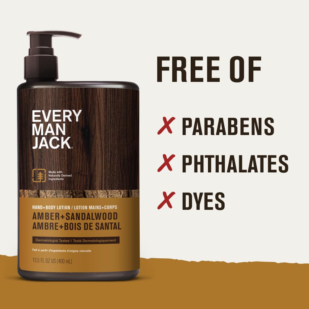 Every Man Jack Mens Amber + Sandalwood Hand & Body Lotion for All Skin Types – Dermatologist Tested & Hypoallergenic – Nourish Skin with Lightweight Fast Absorbing Lotion – 13.5oz 2 Bottles