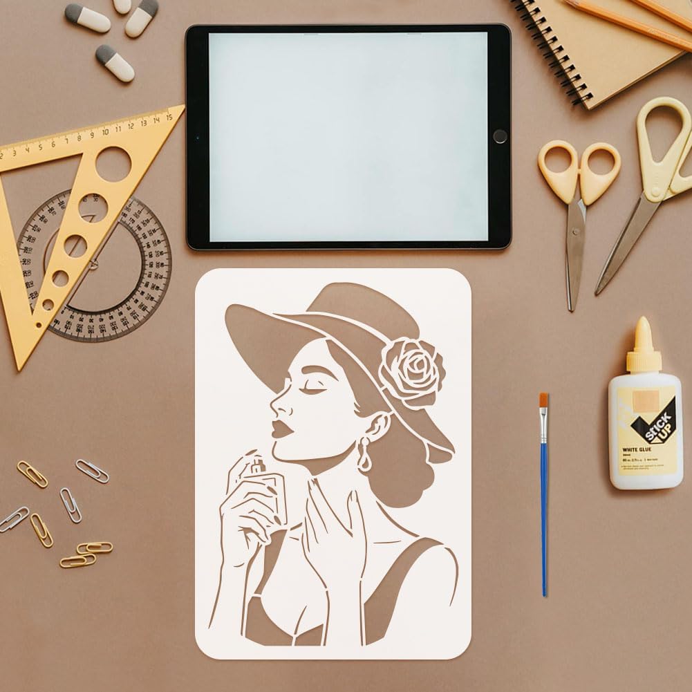 FINGERINSPIRE 4Pcs Perfume Woman Painting Stencil with Brush A4 Size 11.7×8.3inch Woman Stencil Template Reusable Lady Art Silhouette Stencils Women Theme Stencils for Painting on Wood, Paper, Fabric