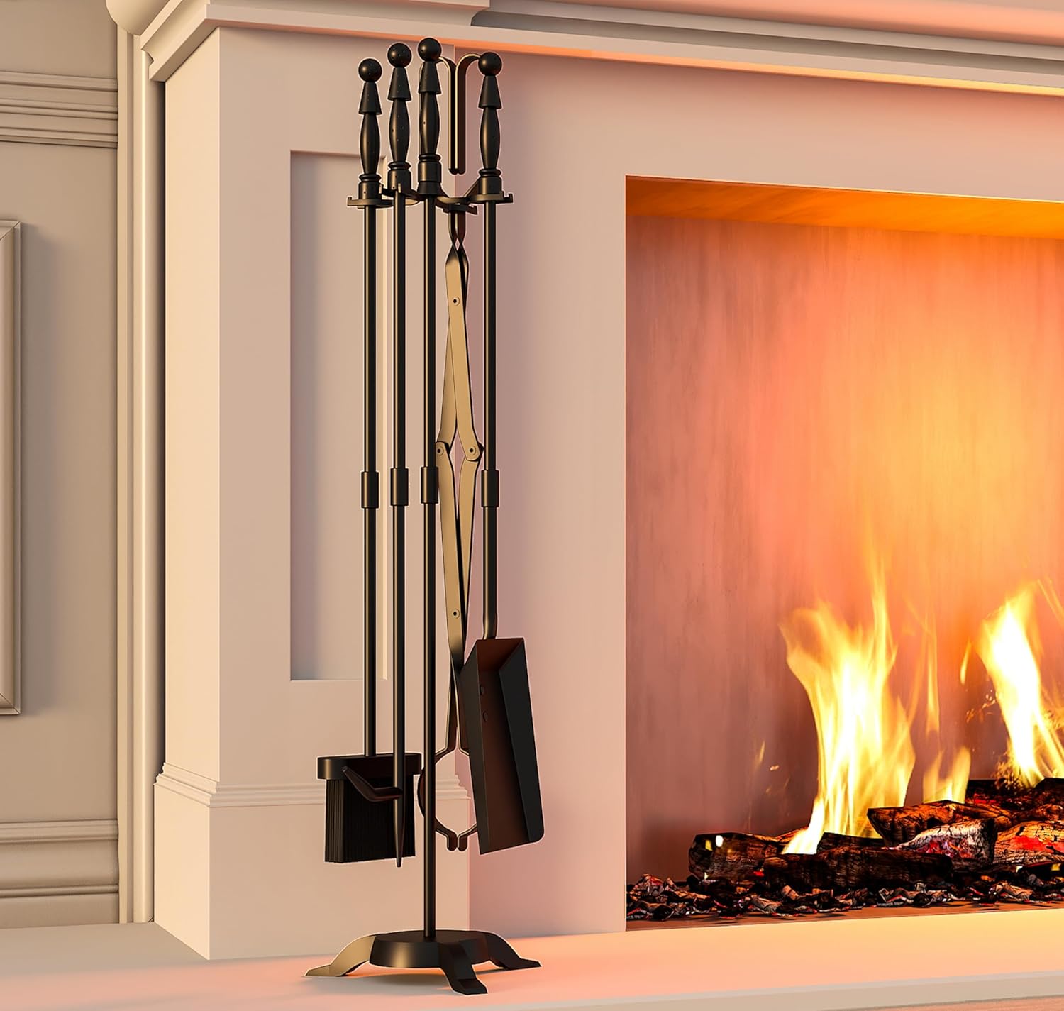 STURDY AND SAFELY: The heavy-duty Fireplace Tool Sets are made of durable wrought iron with modern powder coating on the surface. With excellent workmanship, the fireplace tools will not bend and break easily. Most importantly, this fireplace tong can keep you away from the heat and keep a safe distance from the fireplace, but at the same time allows you to manipulate hot burning logs and sweep away dust.