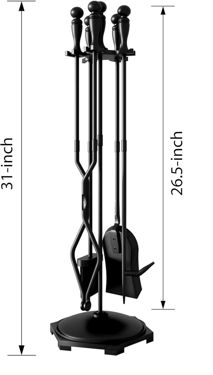 5 PCS Combination of Fireplace Tools:31 inch height fireplace tool holder adopts a heavy duty hexagonal cast iron base for stability.The top support of tools set can not only Keep fireplace Brush,Tong,Shovel,Poker neatly fixed,but also saves space and tidy storage,bid farewell to messy.Integrated appearance brings decoration and beauty.