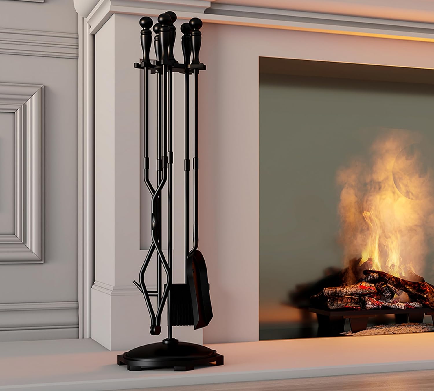 STURDY AND SAFELY:The heavy-duty fireplace tool Sets are made of durable wrought iron with modern powder coating on the surface.With excellent workmanship,the fireplace tools will not bend and break easily.Most importantly,this fireplace tong can keep you away from the heat and keep a safe distance from the fireplace,but at the same time allows you to manipulate hot burning logs and sweep away dust.