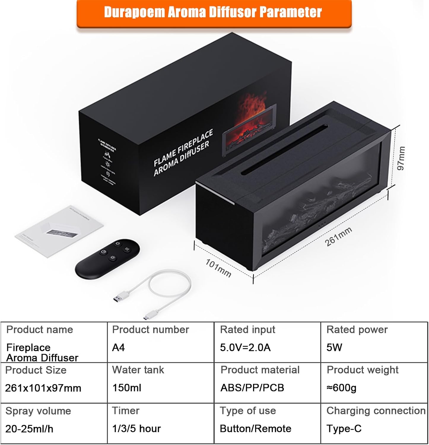 Parameters Water tank capacity: 150ml Fog volume: 20-25ml/hour Rated power: 5V Operating current: 2A Product weight (bare): 600g Product size: 10.3*4*3.9 inches/27*10*9.7 cm Product material. ABS/PP/PCB