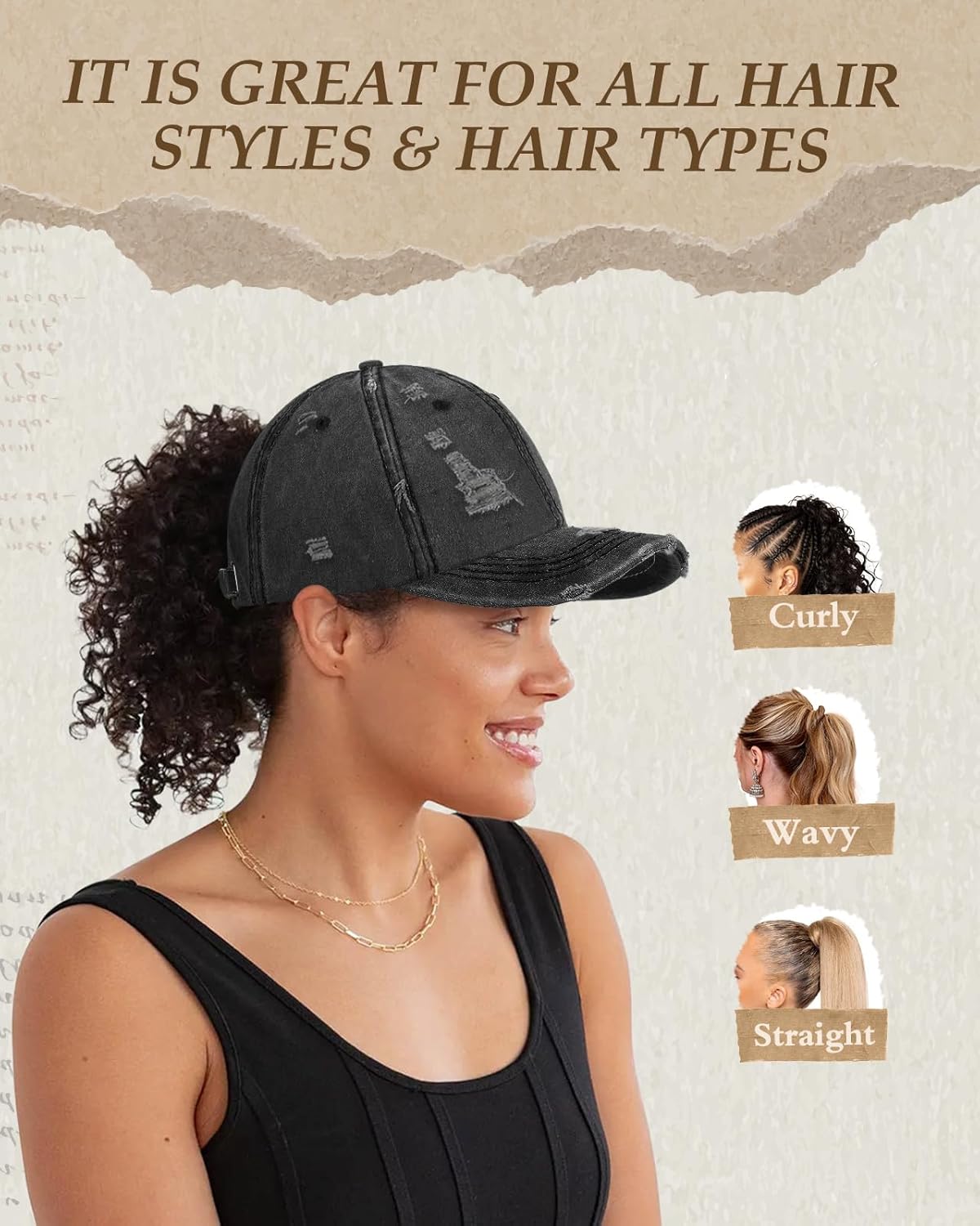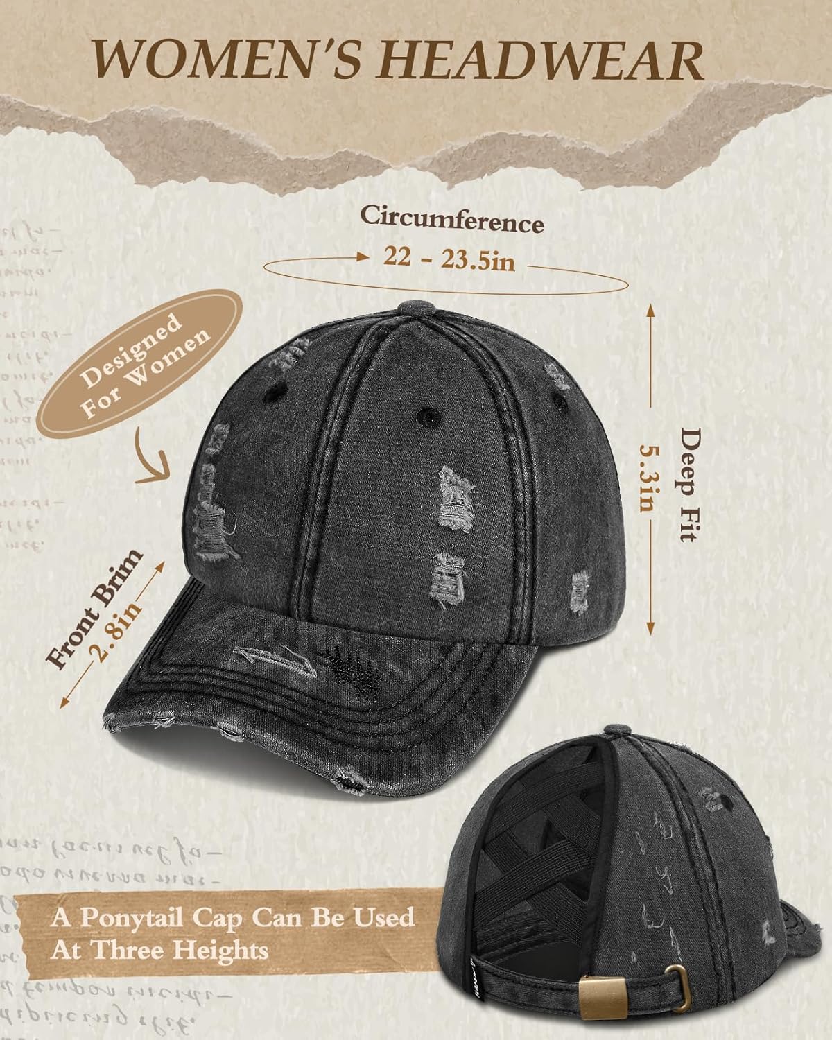 The video showcases the product in use.The video guides you through product setup.The video compares multiple products.The video shows the product being unpacked. Women pony hats Merchant Video