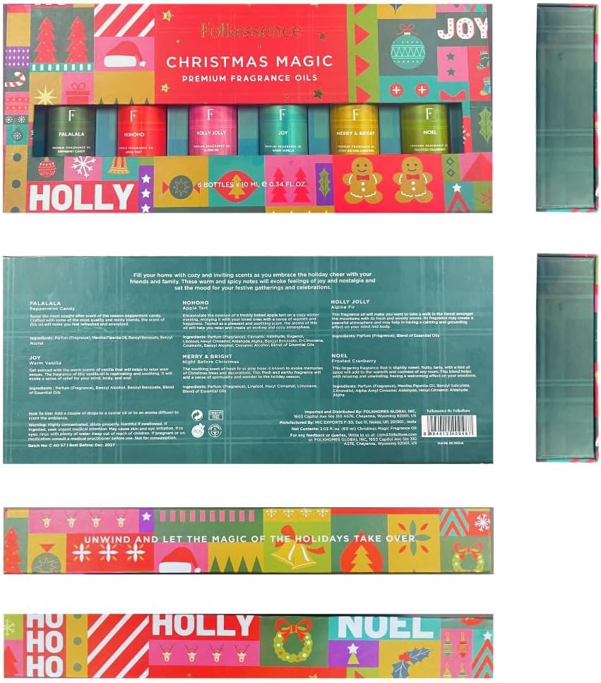 [VALUE PACK – Set of 6 Christmas Essential Oils] – Experience the magic of the season with the Folkulture Christmas Fragrance Oils Set. This set includes 6 essential oils for your diffuser: Peppermint, Candy, Apple Tart, Cranberry, Vanilla, and Christmas Magic. Perfect for creating a festive atmosphere in your home, these Xmas oils offer a blend of sweet and fresh holiday scents that bring joy and warmth to any space.