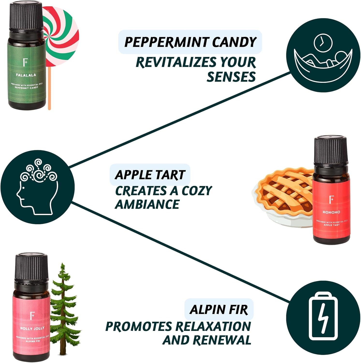 [BENEFITS – RELAXATION & HOLIDAY CELEBRATION] – Infuse your home with the delightful Christmas scents of Peppermint, Candy, Apple Tart, Cranberry, Vanilla, and Christmas Magic. These oils not only enhance the festive mood but also promote relaxation, helping you unwind after a long day of holiday activities. Whether used in your Xmas diffuser or as part of your holiday aromatherapy, these oils bring tranquility and joy to your home.