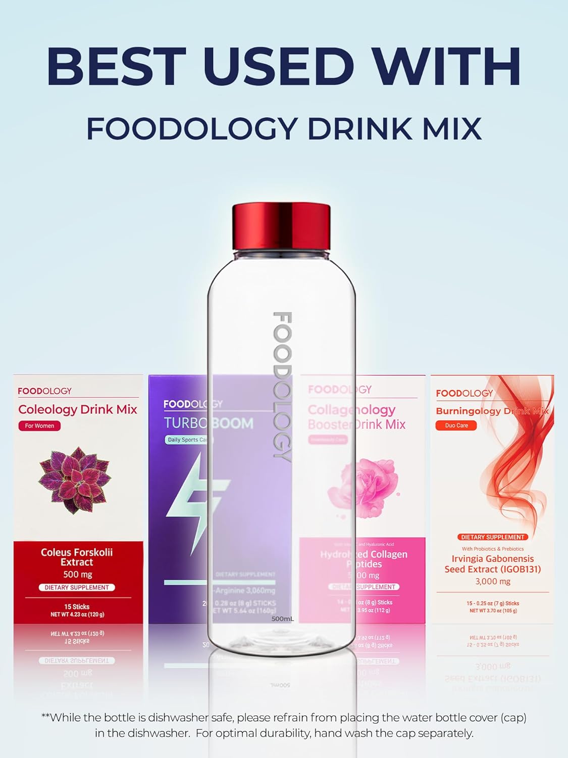 FOODOLOGY Bottle for Drink Mix (Red, 16.9fl oz) – Leak Proof, Lightweight, Durable Sports Water Bottle. Reusable for Gym, Outdoor, Travel. BPA Free, Clear Beverage Container with Marker