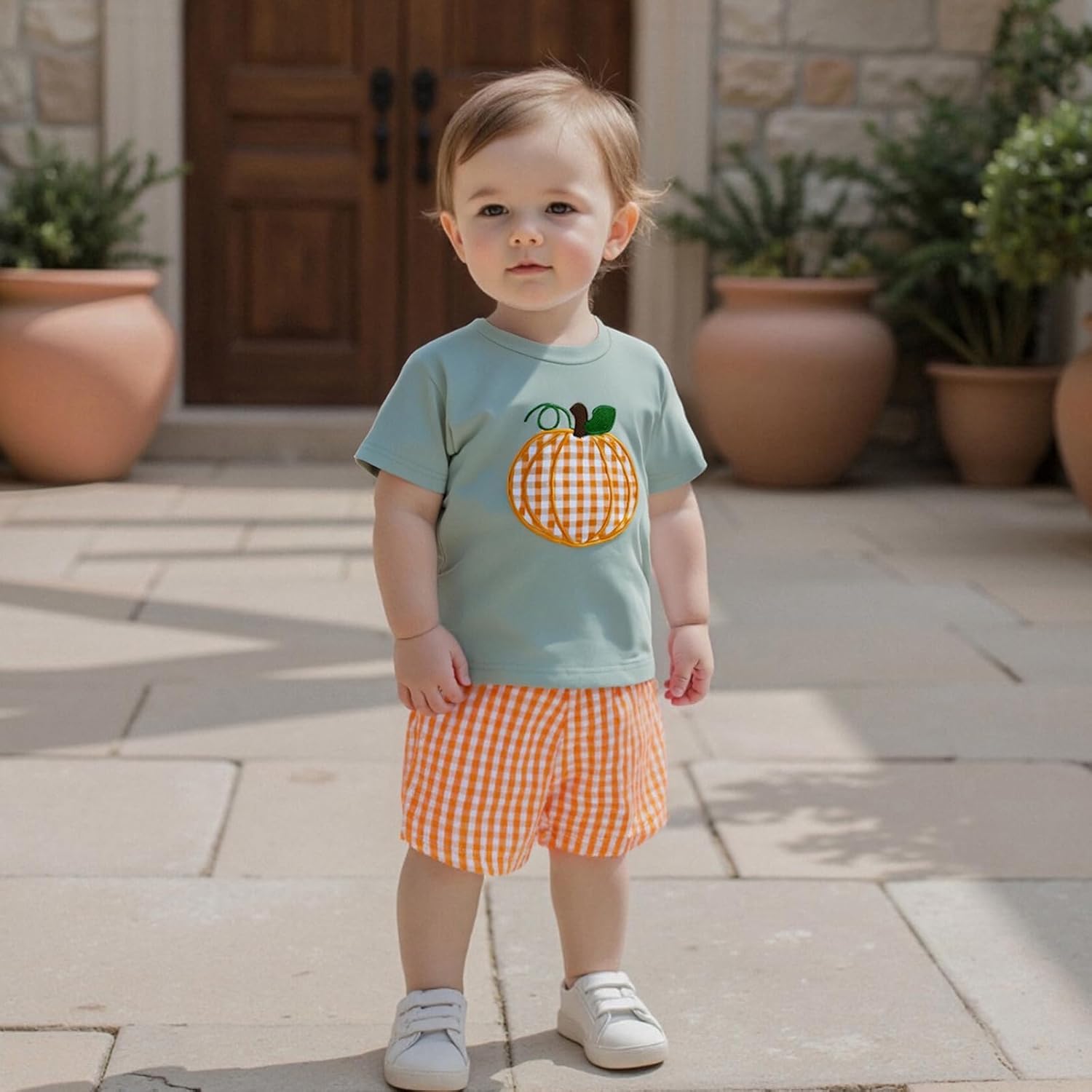 Gaono Toddler Baby Boy Halloween Clothes Pumkin Patch Short Sleeve T-shirt Plaid Shorts 2 Piece Set Infant Pumpkin Outft