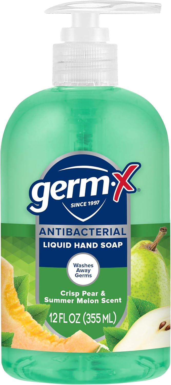 Germ-X Crisp Pear & Summer Melon Antibacterial Liquid Hand Soap helps kill harmful germs while being gentle enough for everyday use on your skin. Our Antibacterial Liquid Hand Soap has a Tropical infusion of water pear, melon and exotic amber scent, and contains a moisturizer to help reduce skin dryness. It is pH balanced, dermatologist tested and tough on germs. Germ-X Antibacterial Liquid Hand Soaps contain an antibacterial formula that helps elliminate the dirt you see and the germs you don’t. It’s effective, yet gentle and mild, so it is great for the entire family, leaving hands feeling clean and fresh. We make Germ-X products that go wherever you do. Whether you’re looking to fight germs in the classroom, office, home or on-the-go, our fast-acting hand soaps and sanitizers come in forms to fit your every need. From convenient pumps, flip-top caps, sprays and even wipes, we’ve got you covered. Live life better. Pack of 4 x 12 oz hand soaps with pump