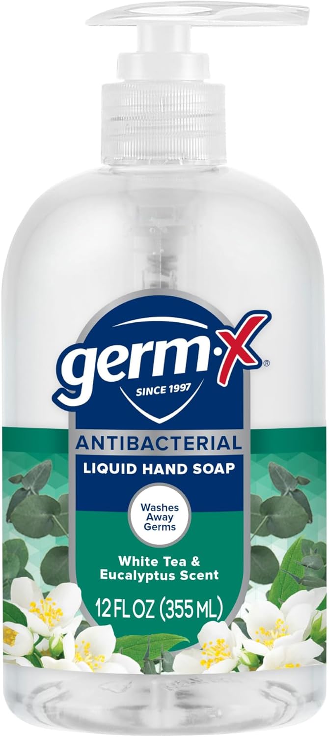 Germ-X White Tea & Eucalyptus Antibacterial Liquid Hand Soap helps kill harmful germs while being gentle enough for everyday use on your skin. Our Antibacterial Liquid Hand Soap has an energizing eucalyptus with lemon zest, lilac, plus mint and tea leaves.scent, and contains a moisturizer to help reduce skin dryness. It is pH balanced, dermatologist tested and tough on germs. Germ-X Antibacterial Liquid Hand Soaps contain an antibacterial formula that helps elliminate the dirt you see and the germs you don’t. It’s effective, yet gentle and mild, so it is great for the entire family, leaving hands feeling clean and fresh. We make Germ-X products that go wherever you do. Whether you’re looking to fight germs in the classroom, office, home or on-the-go, our fast-acting hand soaps and sanitizers come in forms to fit your every need. From convenient pumps, flip-top caps, sprays and even wipes, we’ve got you covered. Live life better. Pack of 4 x 12 oz hand soaps with pump