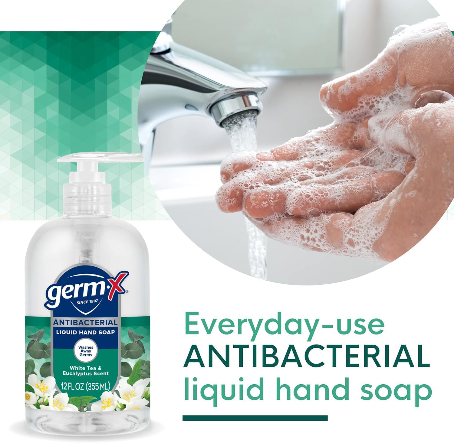 Germ-X Antibacterial Hand Soap, Moisturizing Liquid Hand Wash for Kitchen, pH Balanced & Dermatologist Tested, Back to School Supplies, White Tea & Eucalyptus, 12 oz Pump Bottle (Pack of 4)