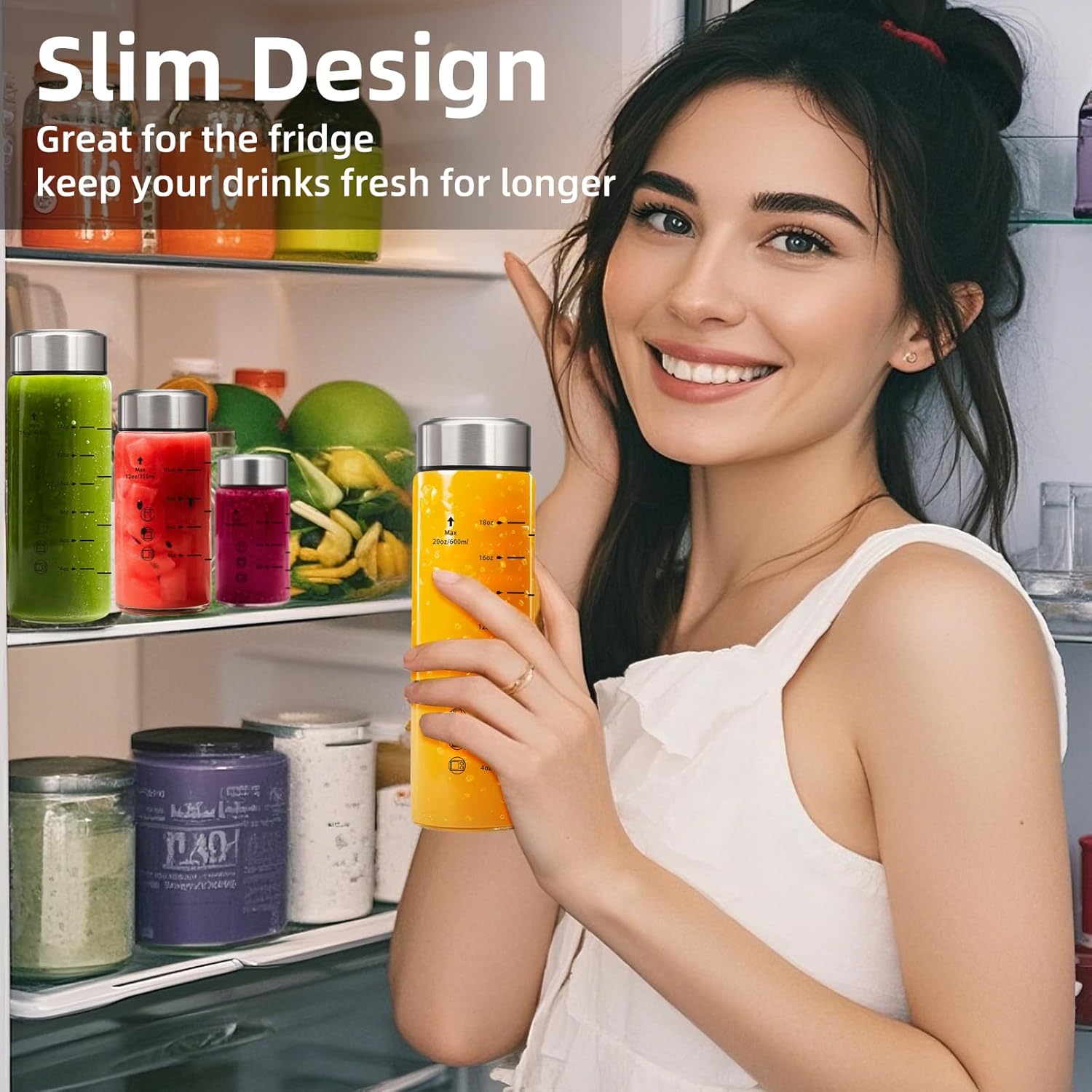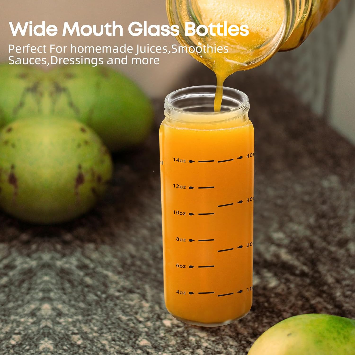 Wide Mouth Opening&Measurement Marking:Wide mouth glass juice bottles make it easy to pour and store smoothies, juices, protein shakes and ice cubes.Ideal for infusing water without fruit chunks getting stuck. Convenient measurement markings add versatility