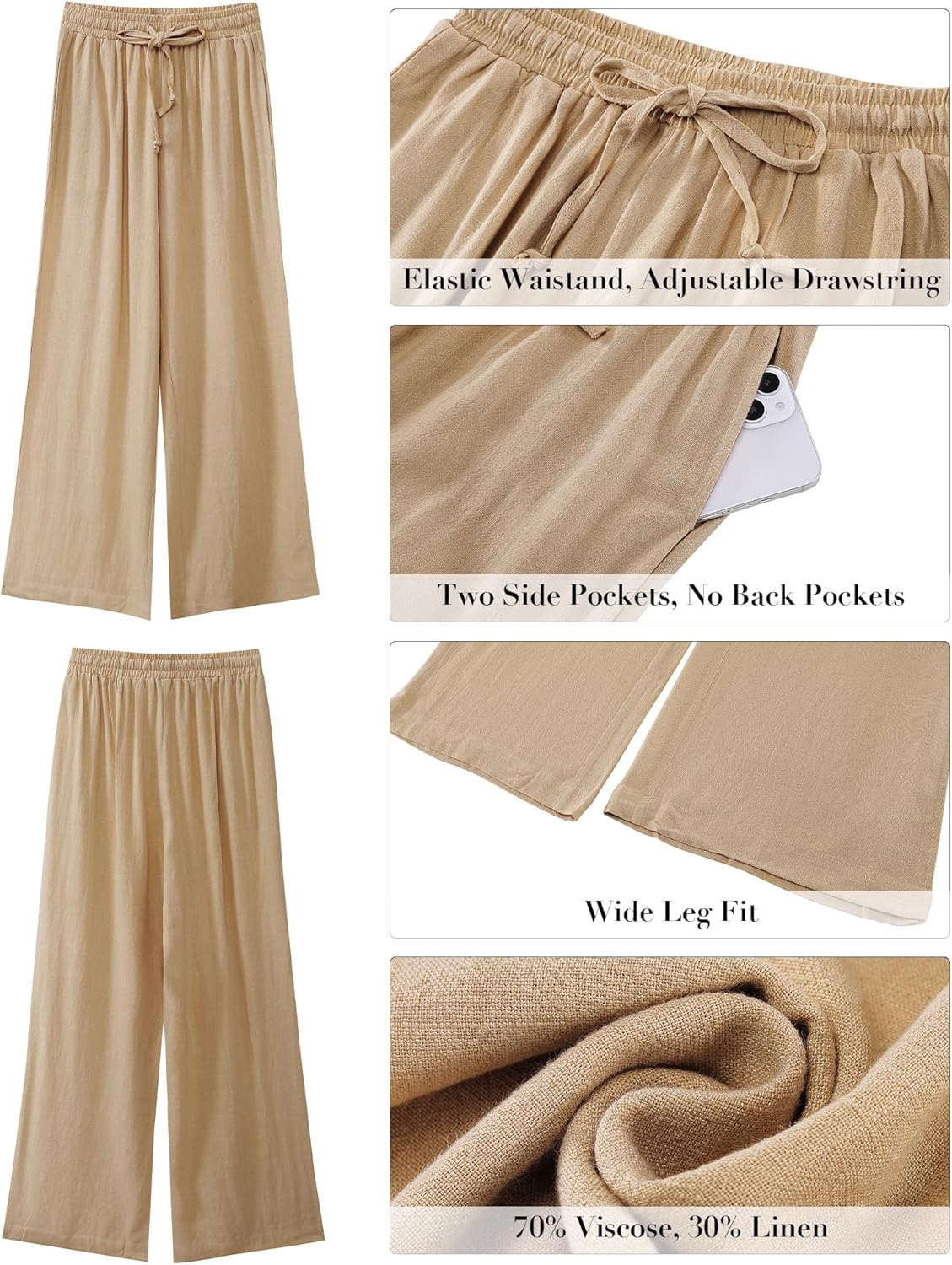 GRAPENT Wide Leg Pants Woman Linen High Waisted Pull On Flowy Casual Baggy Drawstring Palazzo Trousers Pants Resort Wear