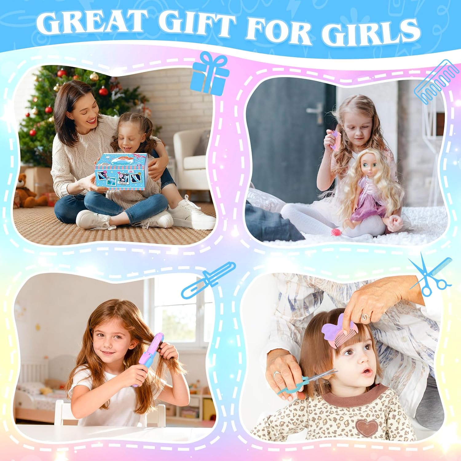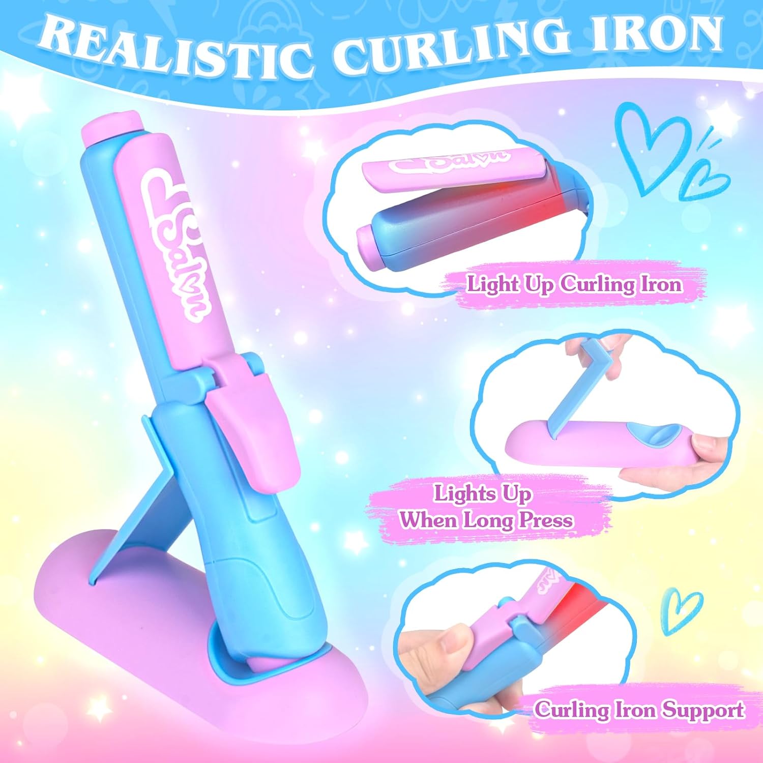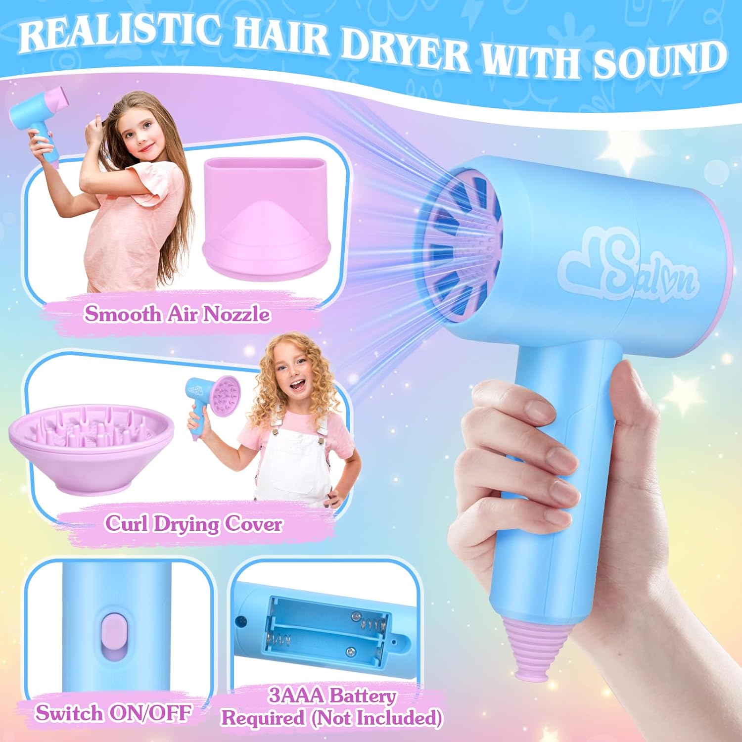 REALISTIC HAIR SALON DRYER & CURLING IRON — Hair dryer set is very realistic. As long as the battery is installed, it can make noise and blow air like a real hair dryer Bring an immersive experience. It has two interchangeable hairstyle accessories (note: 2* AAA batteries are required. Not included). The curling iron with support will light up during use, adding a touch of magic to the adventure of hairstyles. Can use different hair dryers according to their needs to blow various hairstyles. This hair salon toys for girls is specially designed, experience the joy of being a hairstylist