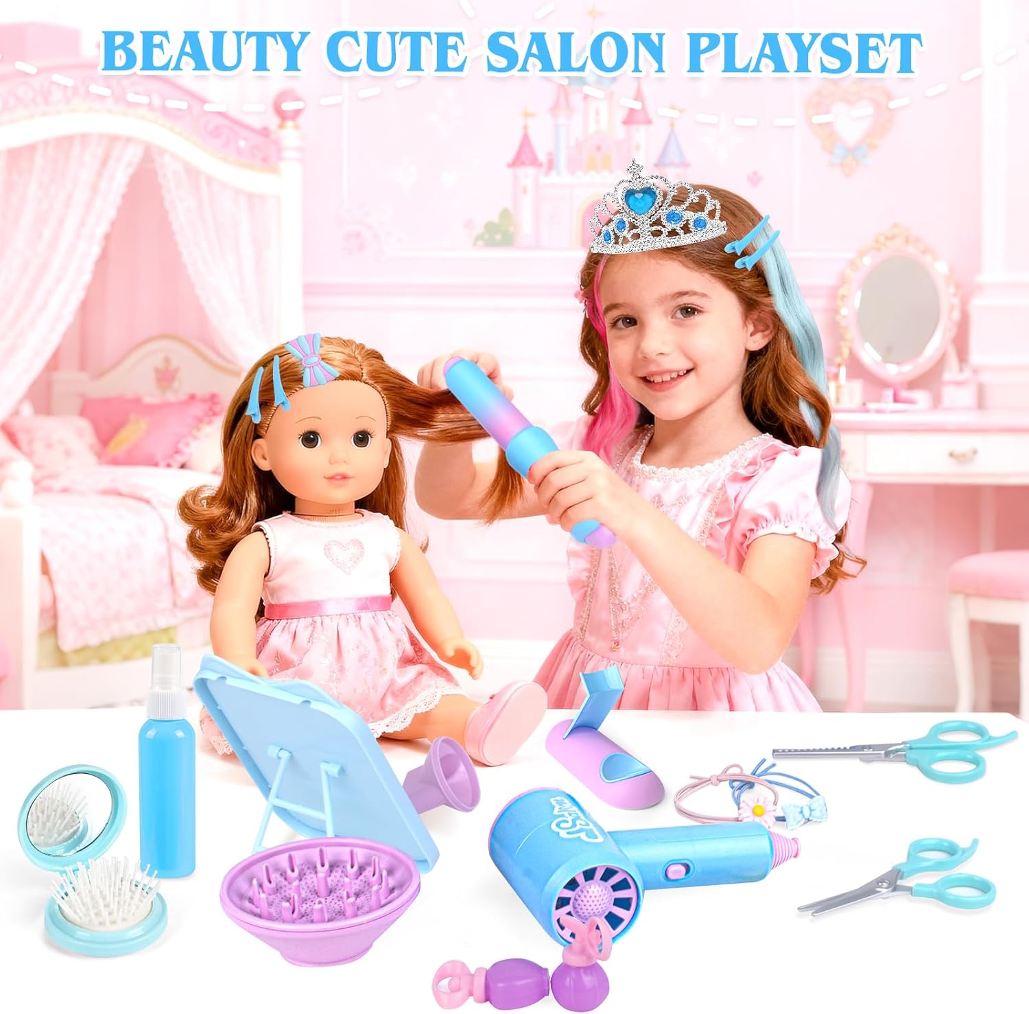 38PCS KIDS HAIR SALON PLAYSET — FUSPWEAO hair salon toys for girls kids hair stylist kit includes: Handheld storage box, Realistic hair dryer, Curling iron, Hair straightener, Realistic curling iron, Curling iron support, Apron, Shawl, Mirror, VIP card, Crown, Foldable Haircomb, 60ml spray bottle, Scissors (regular+teeth clipper) X2, Pink blue straight hair wig X2, Hair loop X10(macaron color), Blue duckbill clip X3, Butterfly Knot Headpiece X2, Hair Rope X2, Hairpin X2, Perfume bottle X2. This toddler girl toy comes with a storage box for easy storage, travel, carrying