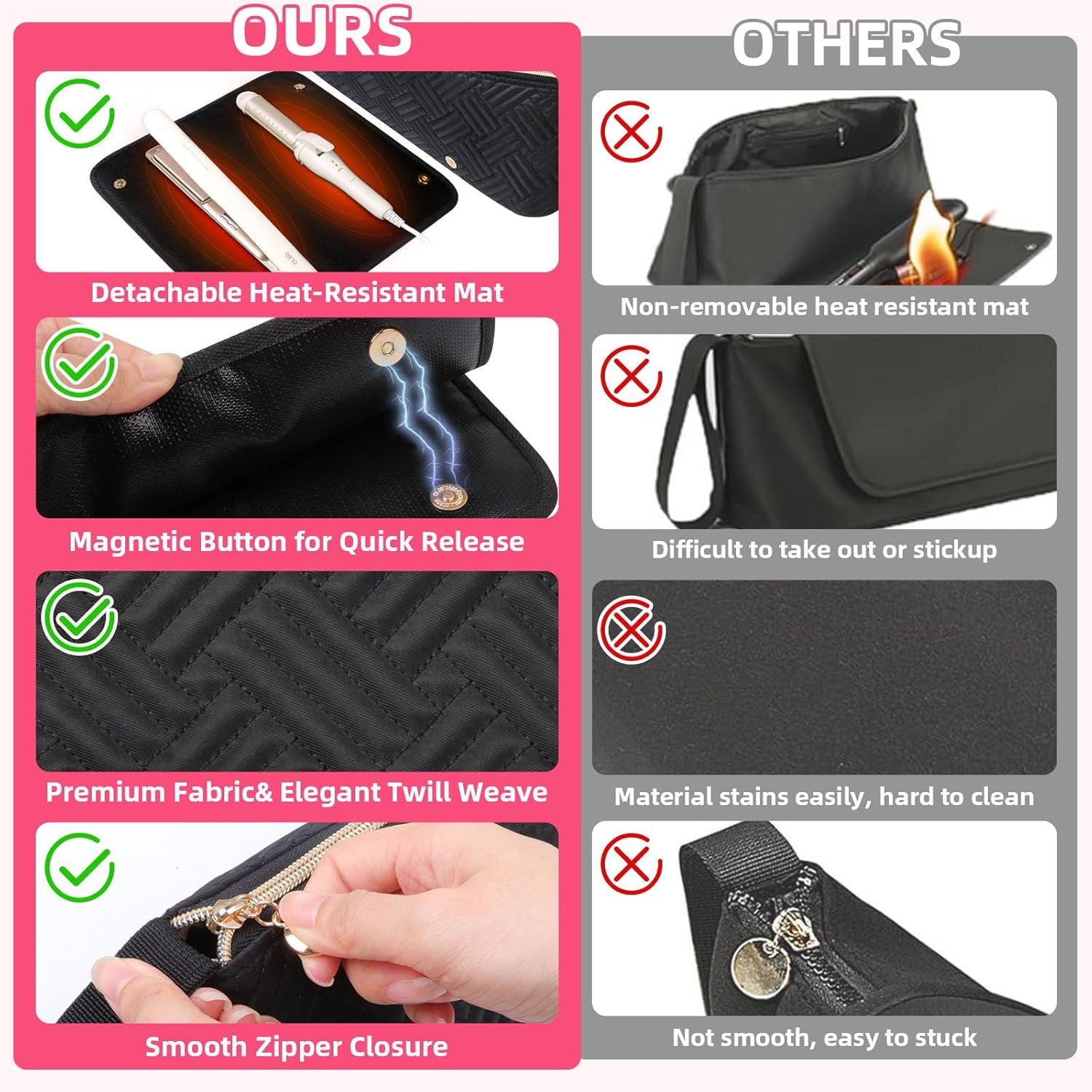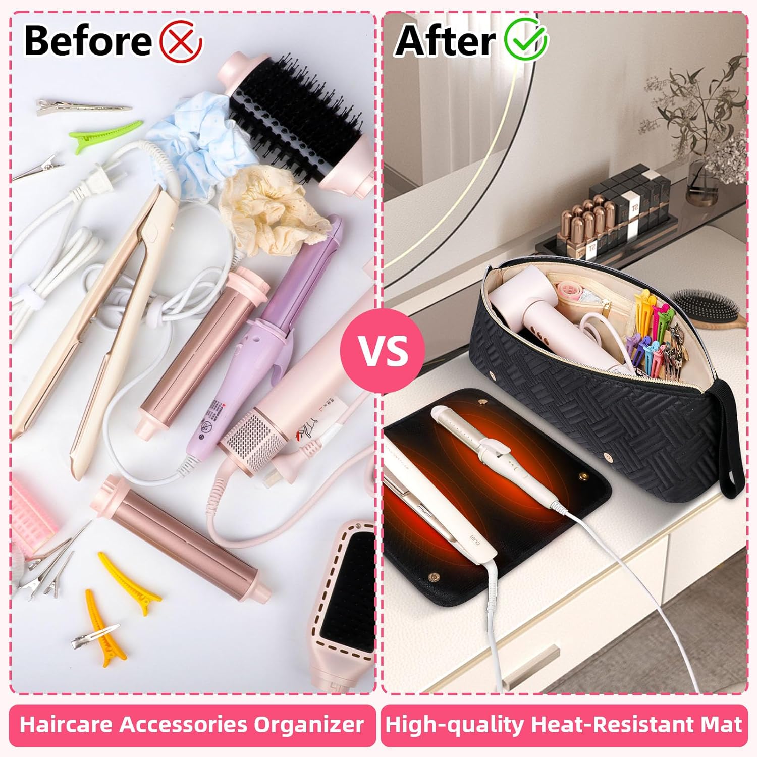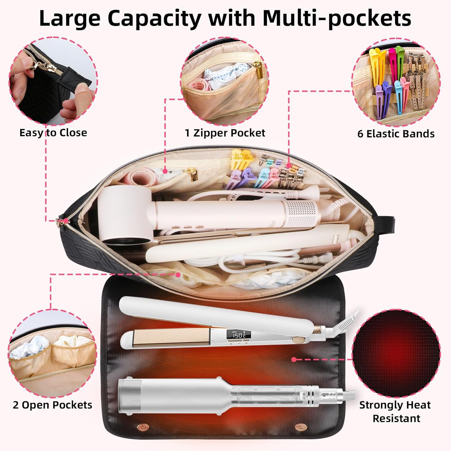 【Premium& Waterproof Nylon Fabric】This hair accessories organizer bag is made of waterproof and wear-resistant nylon fabric, protecting the hair tools in the bag from damage. The heat-resistant pad made of fireproof material prevents hot hair tools from a fire.