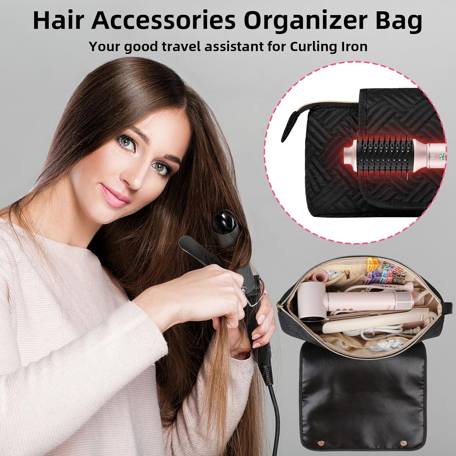 Hair Tools Travel Bag with Heat Resistant Mat, Portable Hair Tool Organizer Travel Carrying Case for Straightener, Flat Iron, Curling Iron, Hair Dryer& Hair Styling Accessories Women (Black)