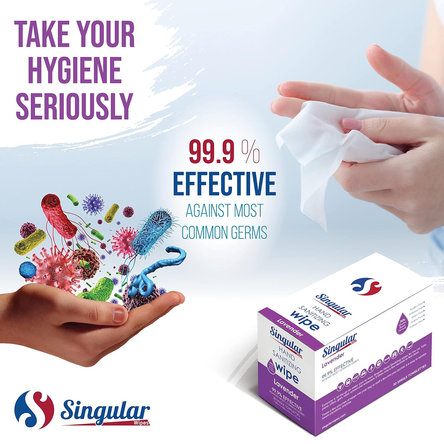 Hand Sanitizing Wipes Travel Size by Singular Wipes – 30ct Individually Wrapped | Lavender Scent, Moisturizing, 70% Alcohol Wipes | Travel, Office, School, Home | Made in USA