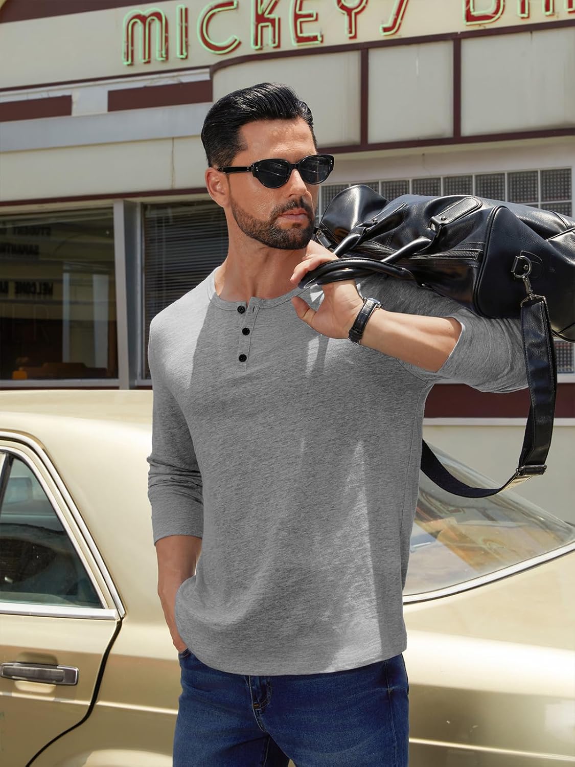 The long-sleeve Henley shirt’s cotton fabric makes it ideal for fall, winter, and spring, delivering comfort all year round.