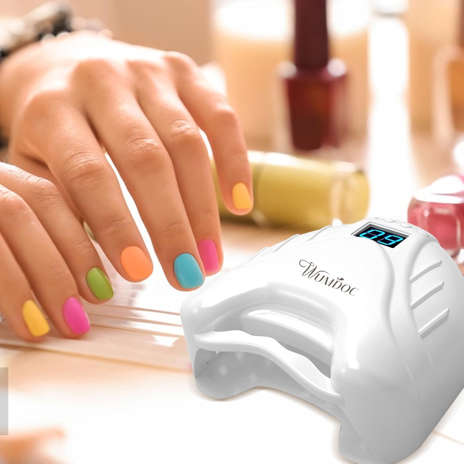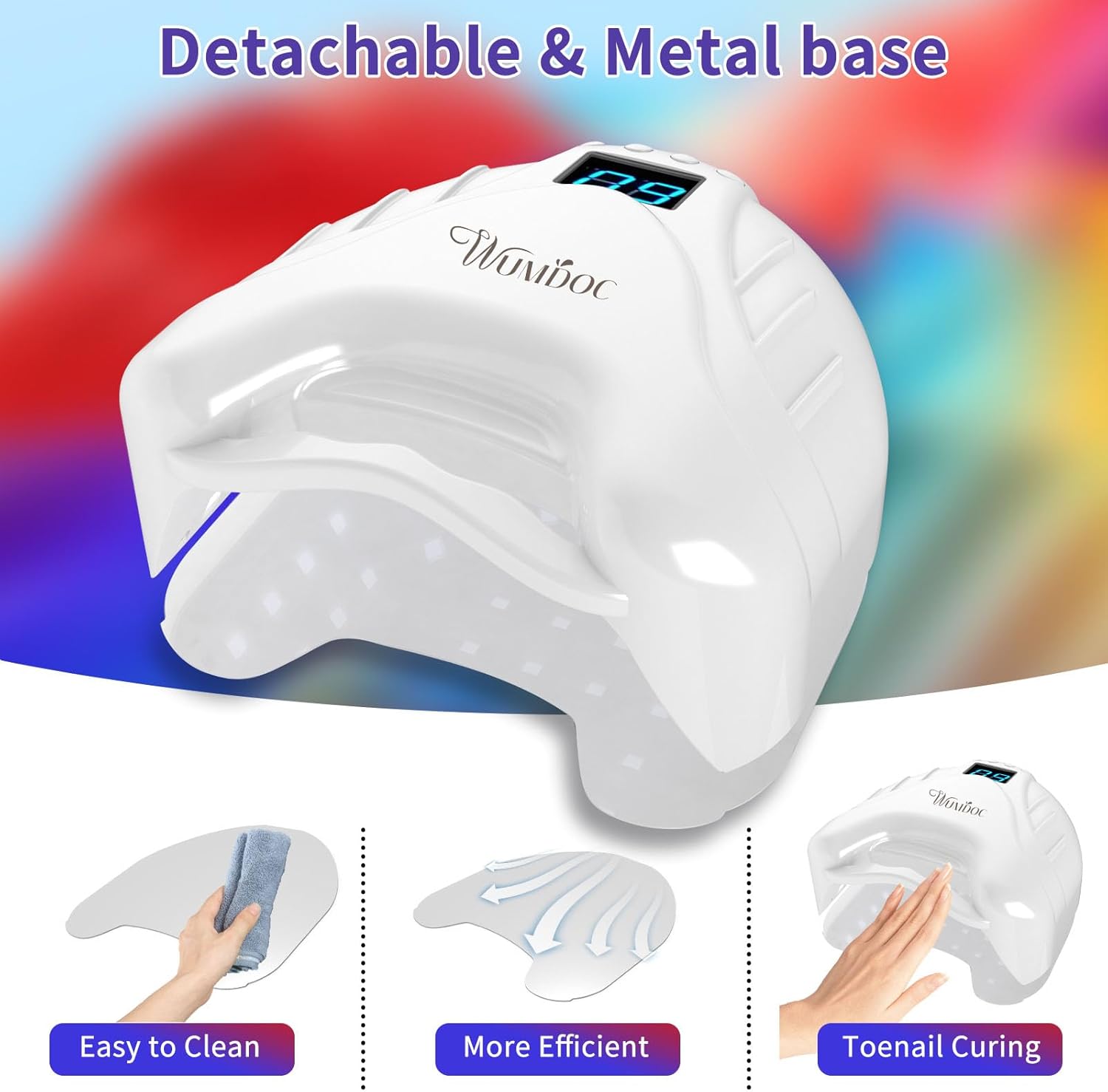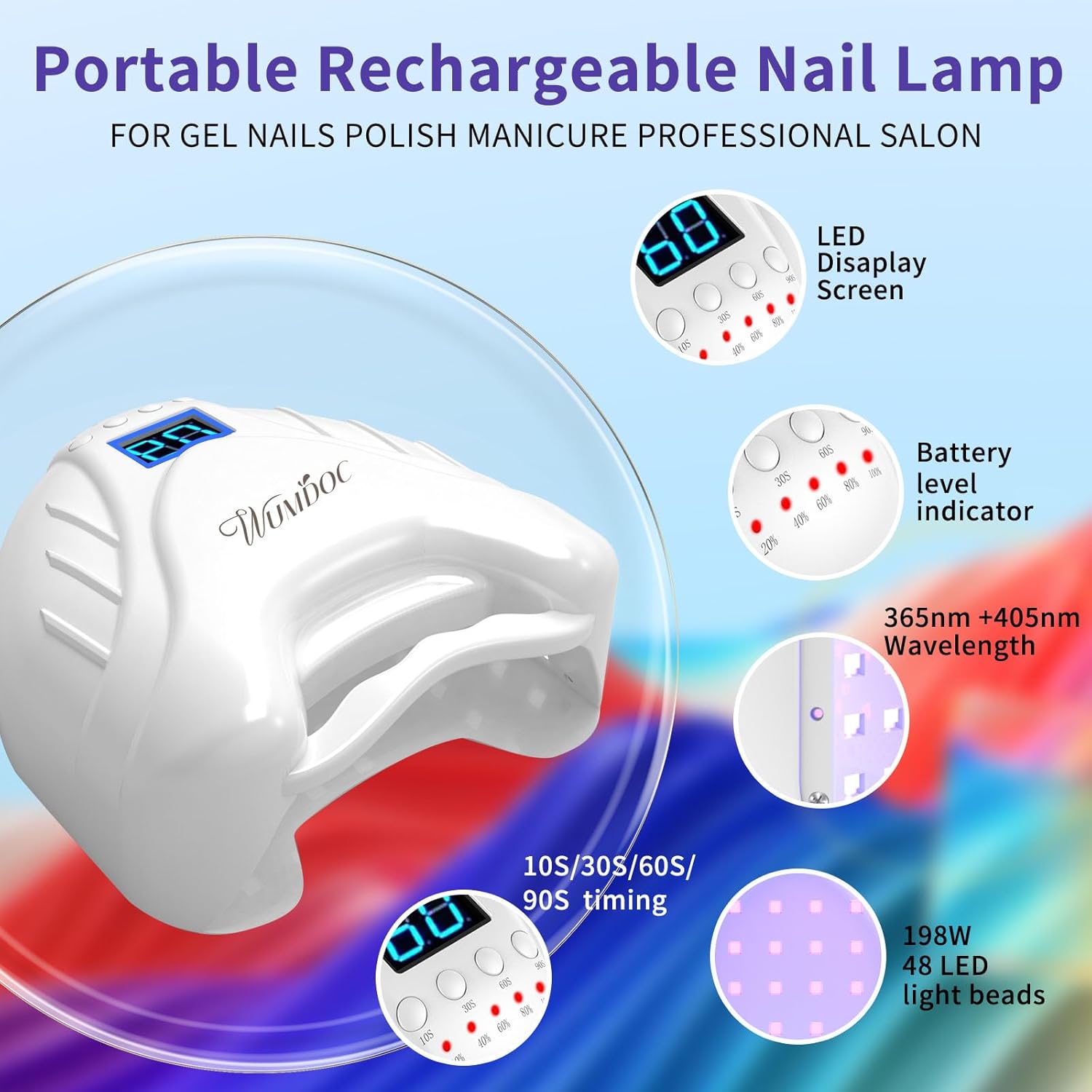 【Dual Light Source & Fast Curing Nail】WUMDOC gel UV led lamp comes with 48 pcs dual light source lamp beads, the light shines from all directions and dries nail polish quickly. And the light is soft (365+405nm) and not glaring which won’t hurt your eyes and no black hands. This flash cure lamp can fast dry all types of manicures and nail art.
