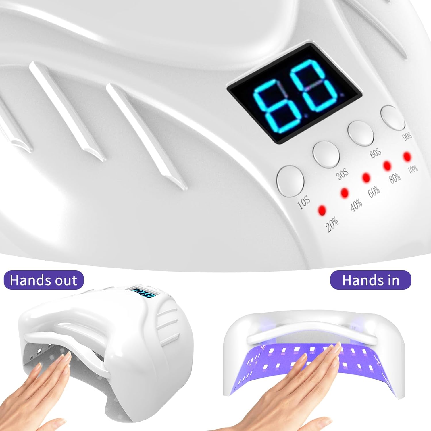[4+ any timer setting and intelligent infrared sensor] Our nail UV lamp has a large full touch LCD screen, there are 4 timer Settings (10S,30S, 60S, 90S,) nail dryer is also equipped with infrared sensor light, hand in light automatically on, hand out light automatically off, no need to set ti to solidify gel nail polish