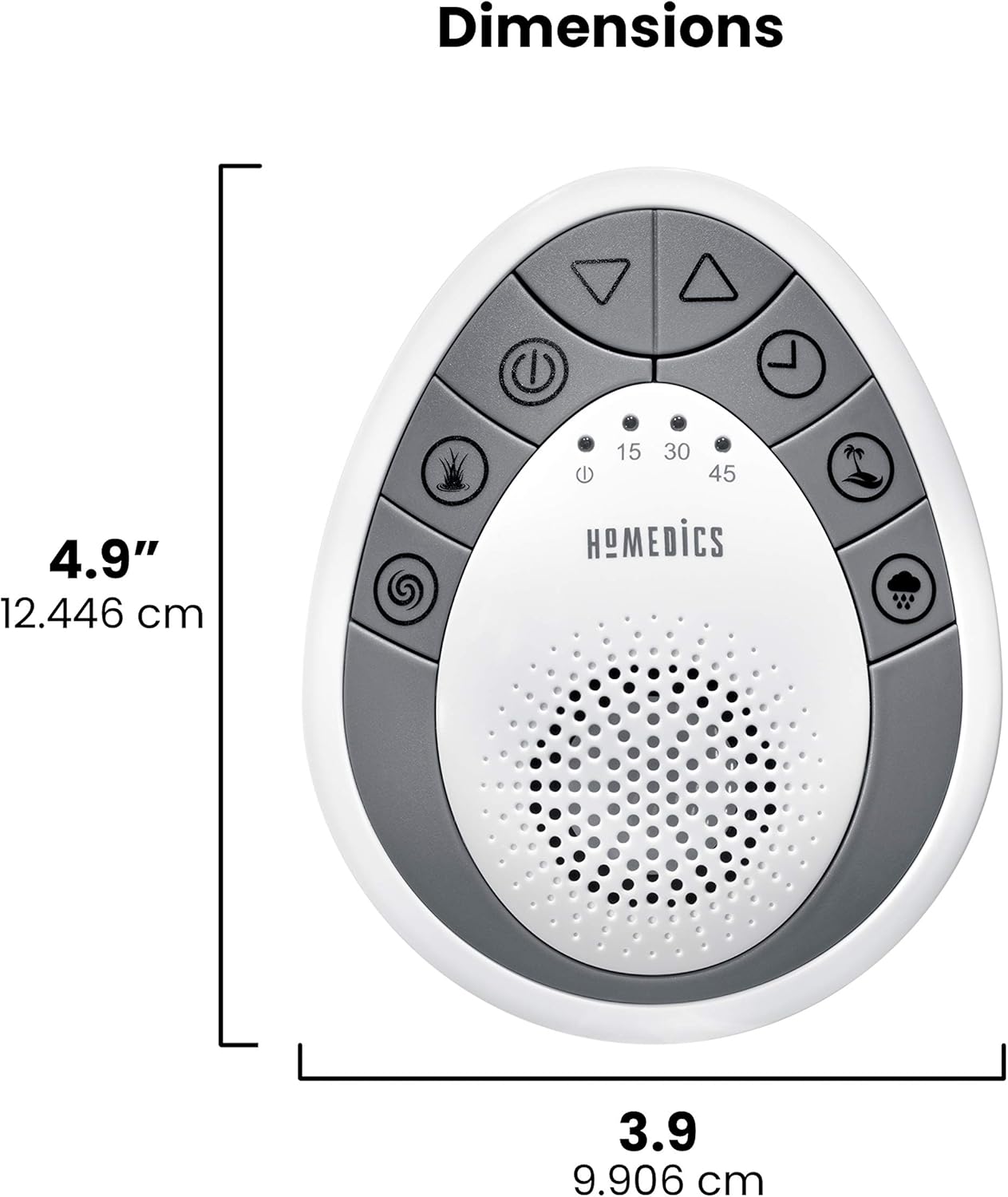 The Homedics® White Noise Sound Machine offers 4 different nature sounds, including White Noise, Summer Night, Ocean Waves, and Rain. The mini sound machine features an adjustable volume setting allowing you to easily relax or fall asleep, even with undesirable background noise. The sound machine is powered by 3 “AAA” batteries (not included). Homedics® White Noise Machine is designed with an auto-off feature. Set the timer for 15, 30, or 45 minutes. Or, if you choose, leave your noise machine on all night! Our sound machine for sleeping is small enough to fit into any purse or travel bag. Bring your relaxation sounds with you to create a peaceful “at home” ambience. Homedics® sounds are created to mimic the natural environment and provide the most relaxing experience for you. Enjoy these sounds whether you are trying to sleep, relax, or study. It also makes the perfect baby sound machine and baby registry must-have. The rhythmic sounds instill a feeling of comfort that lulls those of all ages to sleep.