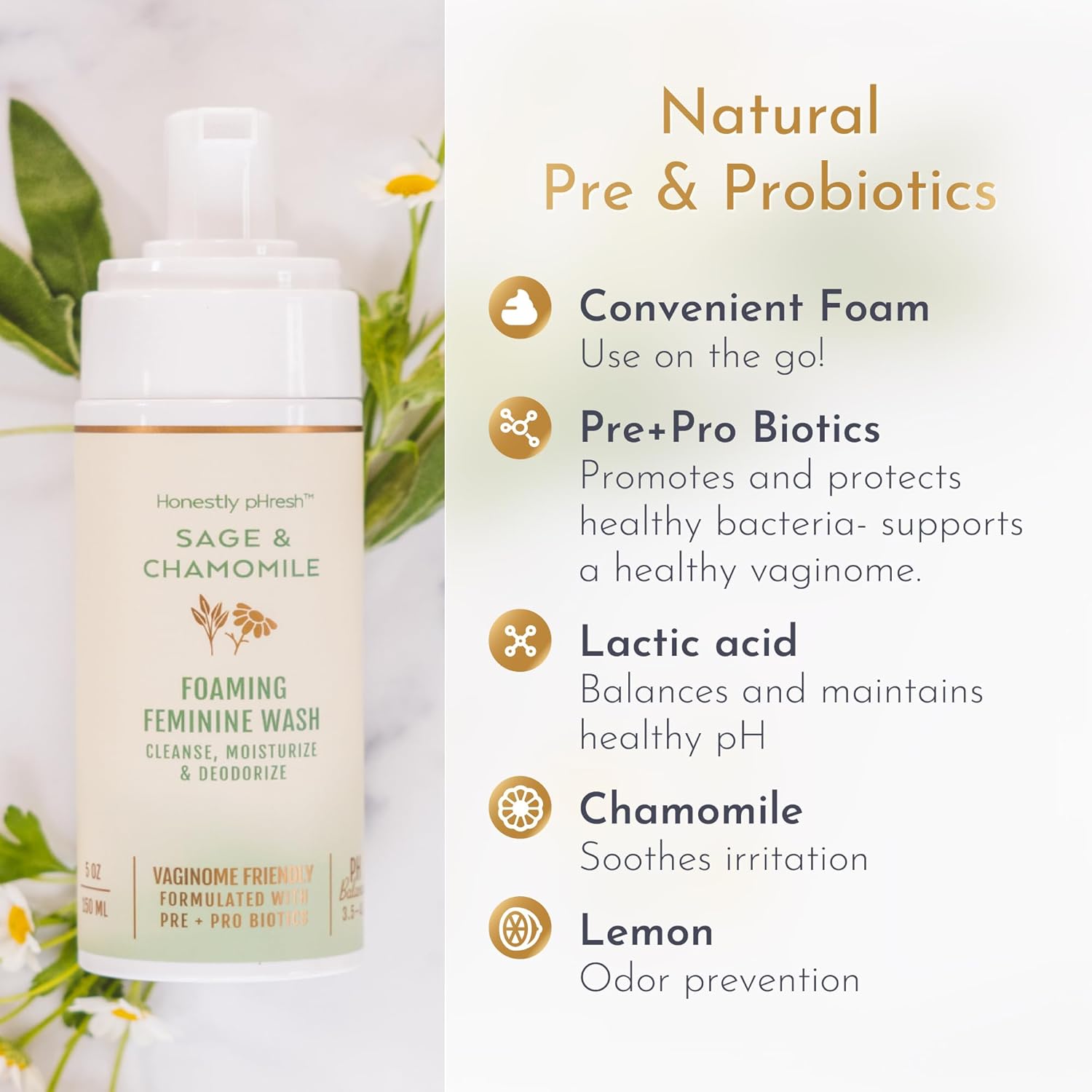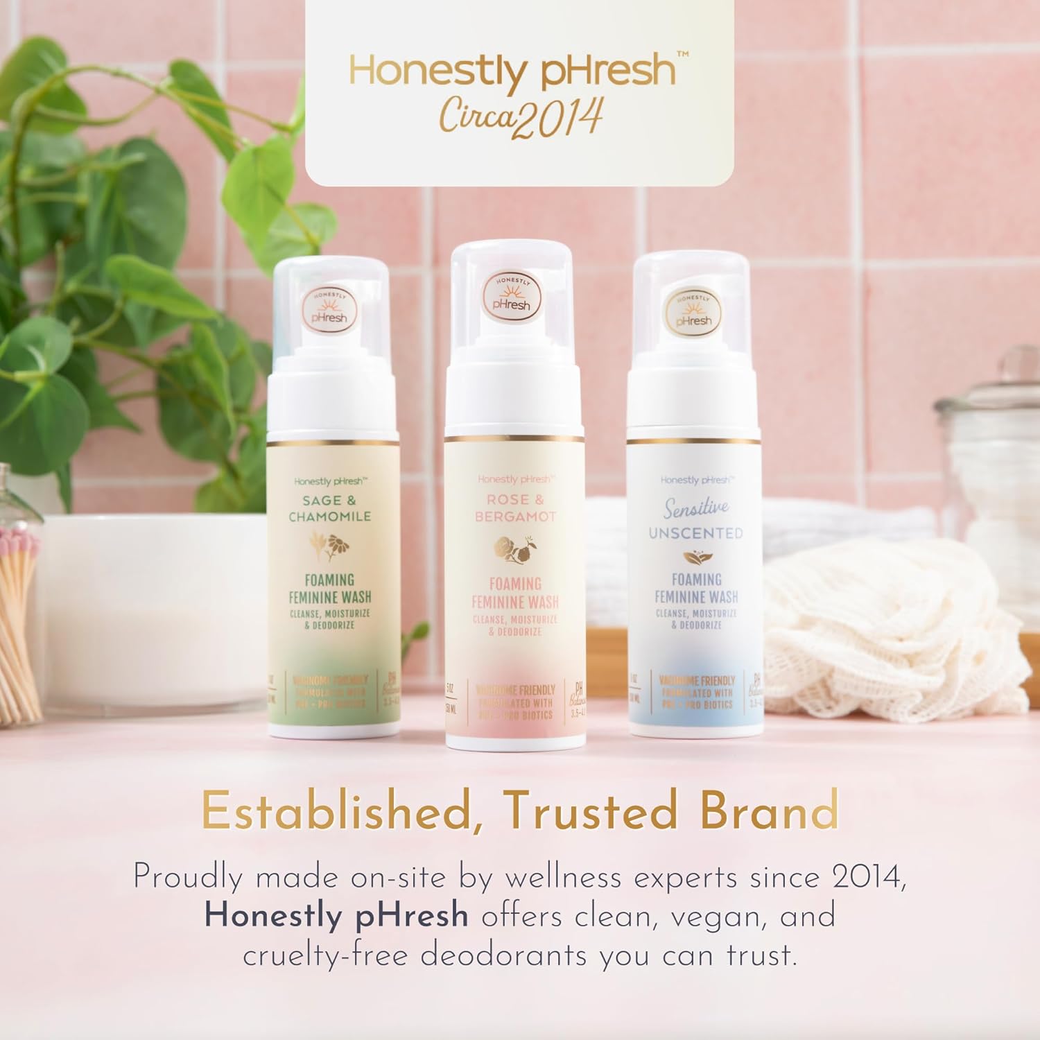 Honestly pHresh Foaming Feminine Wash for Women – pH Balanced Natural Intimate Cleanser with Prebiotics & Probiotics. Vegan, Sensitive Skin Safe. Made In USA – Rose & Bergamot Scent, 5 oz