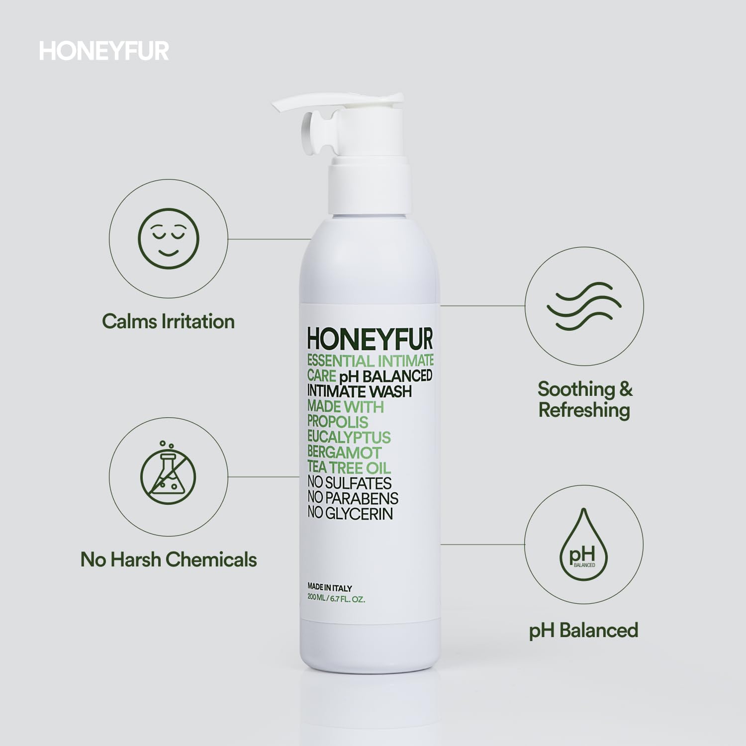 Honeyfur Intimate Wash is formulated with natural ingredients to provide the optimal pH balance to the intimate area. Blended with native European essential oils to cleanse in a delicate way. High-quality ingredients with natural extracts leave the skin soft and velvety. Designed without harmful chemicals. Made in Italy.