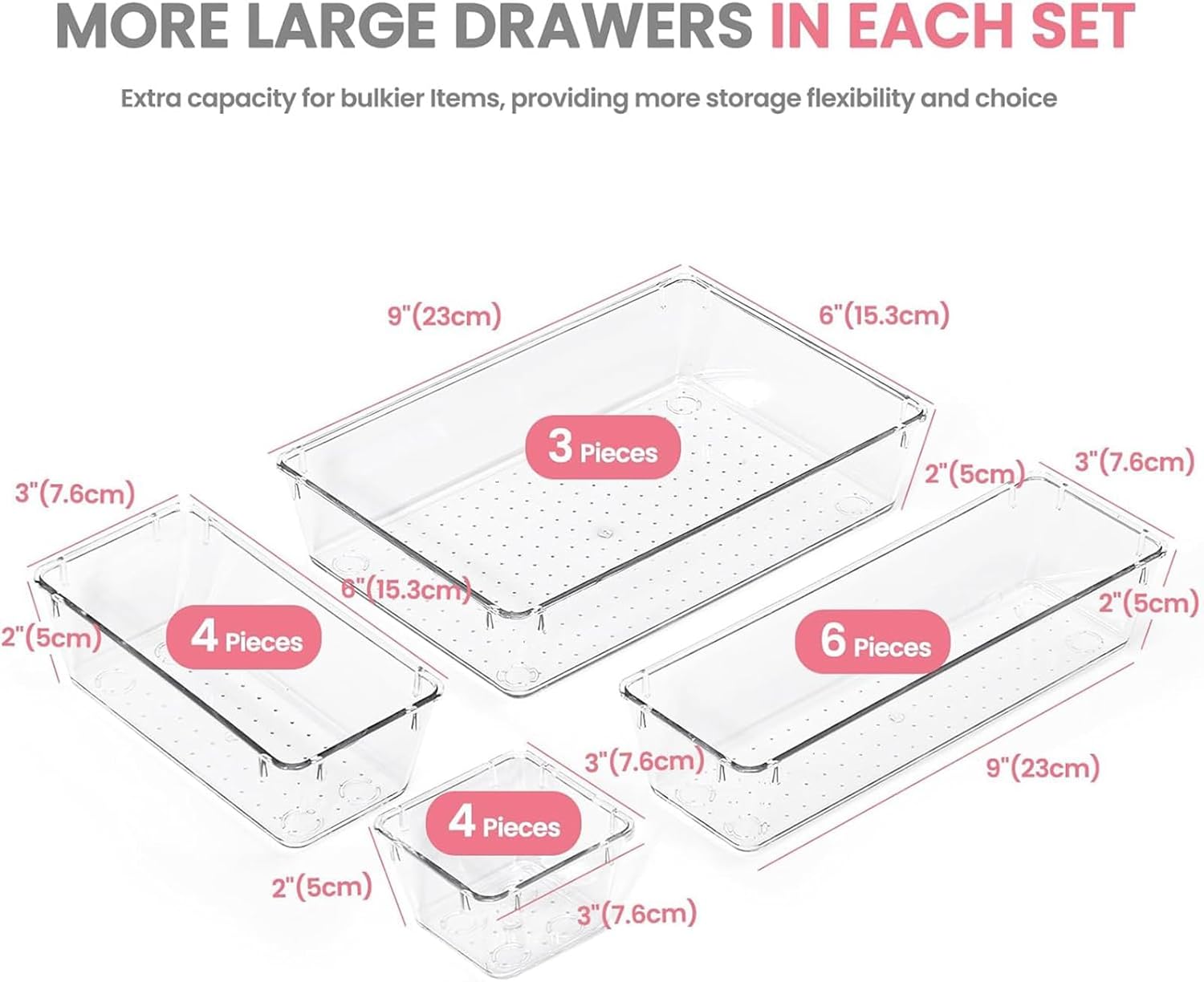 Drawer Organization And Storage: Our vanity organizer has more pieces of large drawer organizer bins than others, provide ample space for bulkier items. This set of acrylic organizers comes in multiple sizes and quantities, allow you to create your own personalized storage solutions that fit your unique needs.