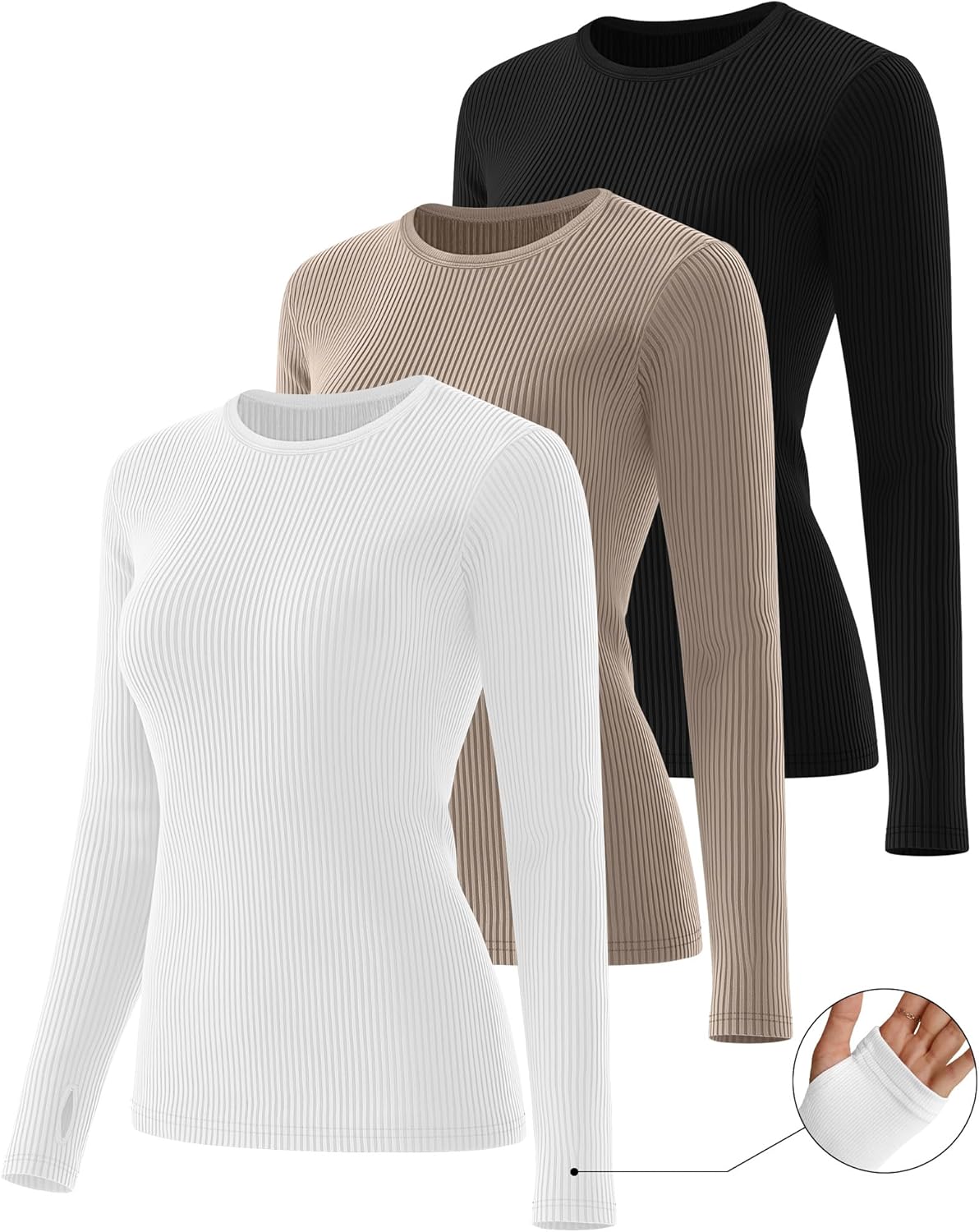 Huukeay 3 Pack Women’s Cotton Ribbed Long Sleeve Tops with Thumb Holes, Crew Neck Undershirt Slim Fit Stretchy Layering Shirt