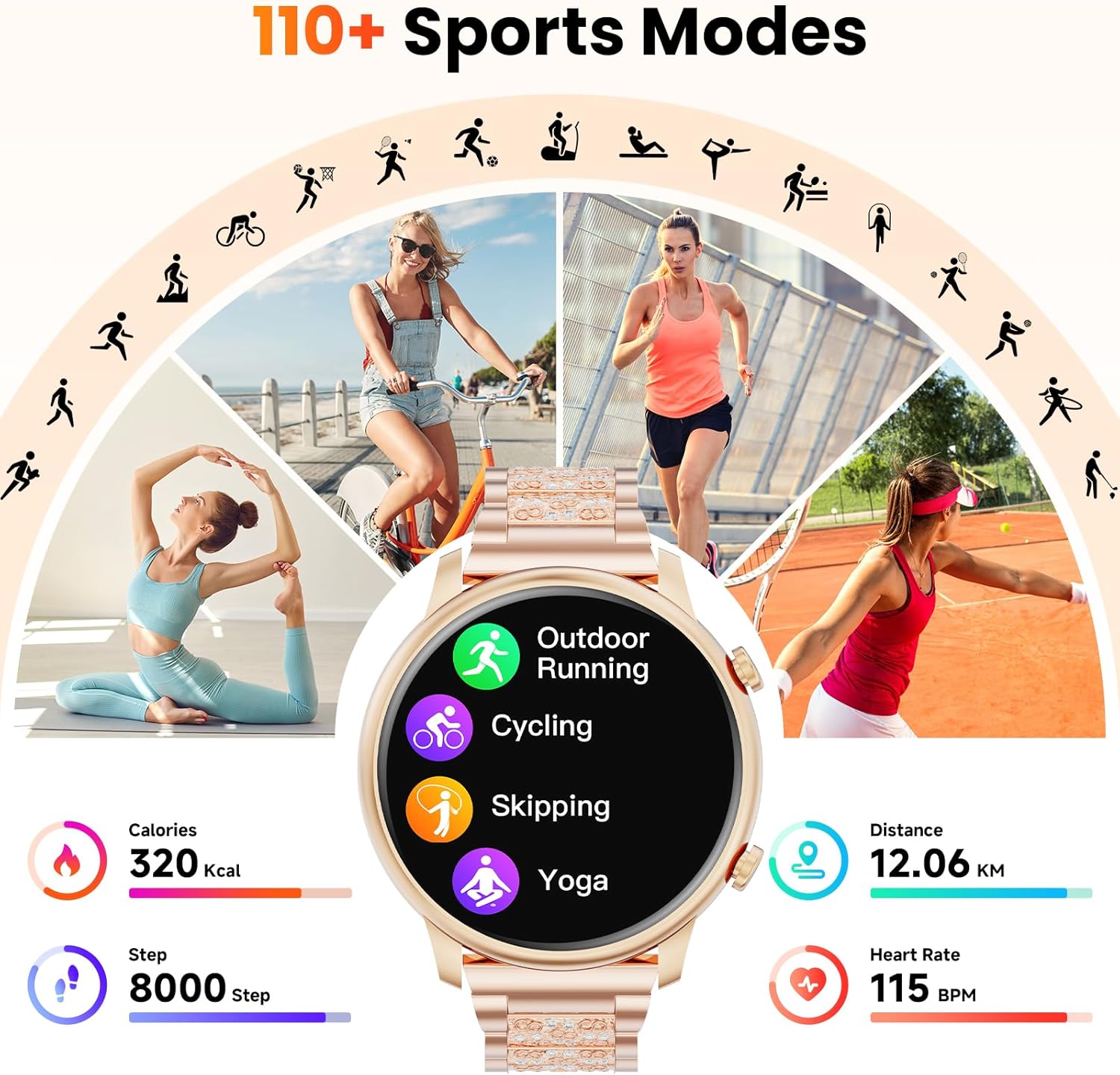 đă24/7 Comprehensive Health MonitoringăThe womens smart watch tracks vital health metricsâheart rate,steps,sleep, blood oxygen, and breathing exercises,calories, distance traveledâproviding you with valuable insights for enhanced well-being. (Note: For reference only; do not use for medical purposes.) .