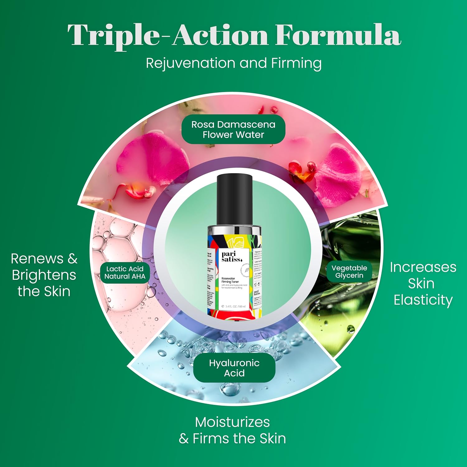 Triple-Action facial toner for women – 3 items in 1 – rosewater toner face for refreshment, AHA toner for face for brightening and hydration toner for face with hyaluronic acid for youthful glow