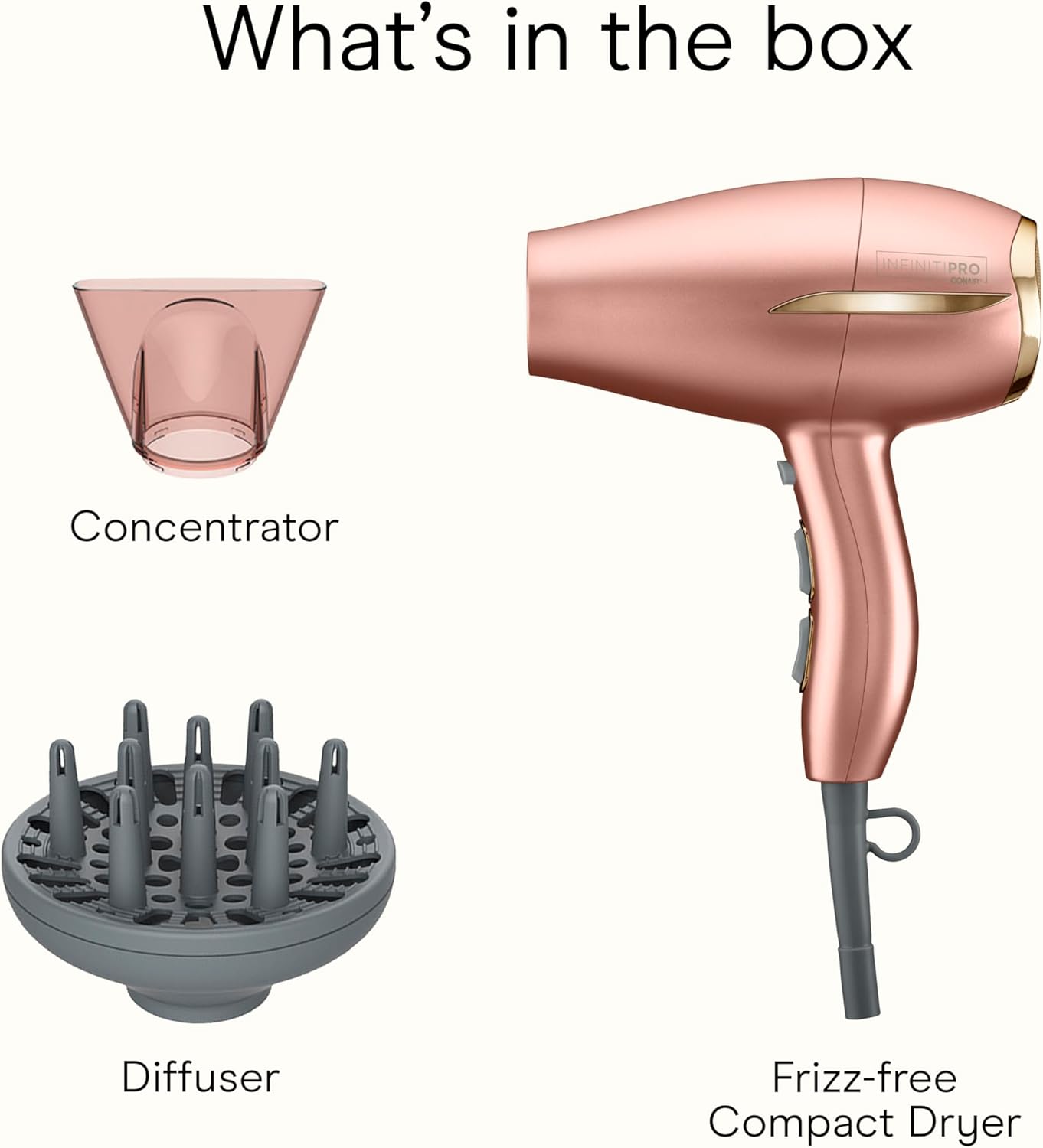 INFINITI PRO CONAIR Hair Dryer, 1875W Frizz-Free and Compact Blow Dryer with Diffuser and Concentrator Attachments, 3 Heat & 2 Speed Settings, Dusty Rose