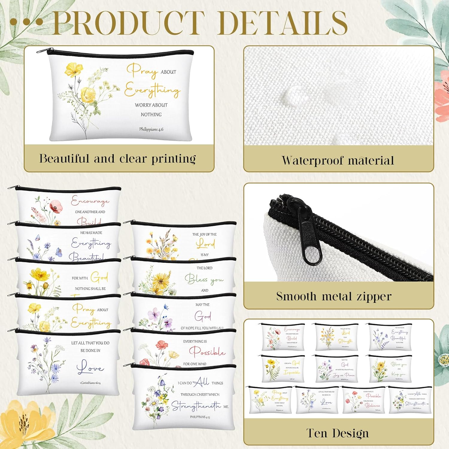 Religious Theme: the zipper make up bag set is printed with meaningful bible verses, decorated with bright flower patterns, looking positive and elegant, which can give you encouragement and bring you visual enjoyment