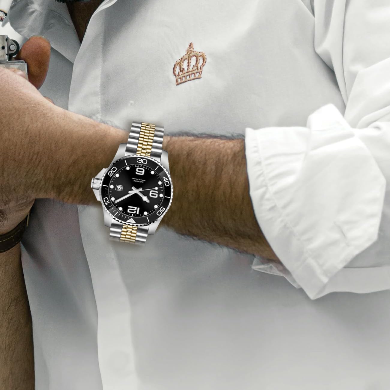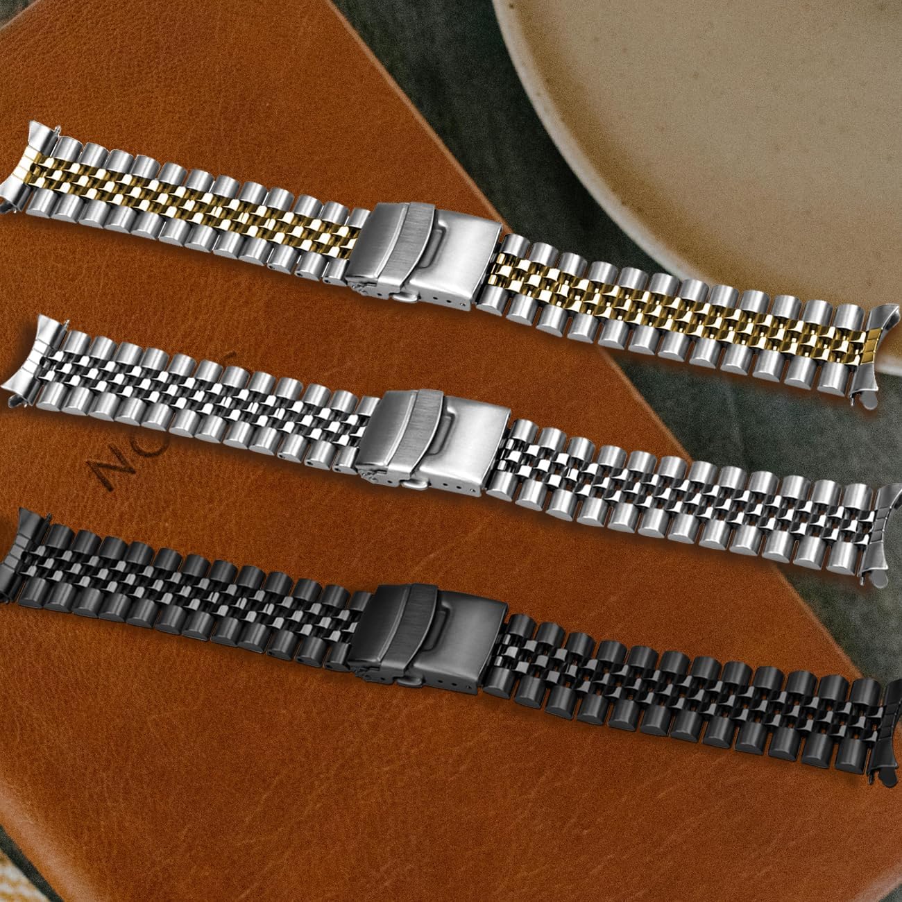 Metal Watch Bands Curved End with Double FlipLock Diver’s Clasp, Black Silver and Silver Gold Jubilee Watch Bracelet